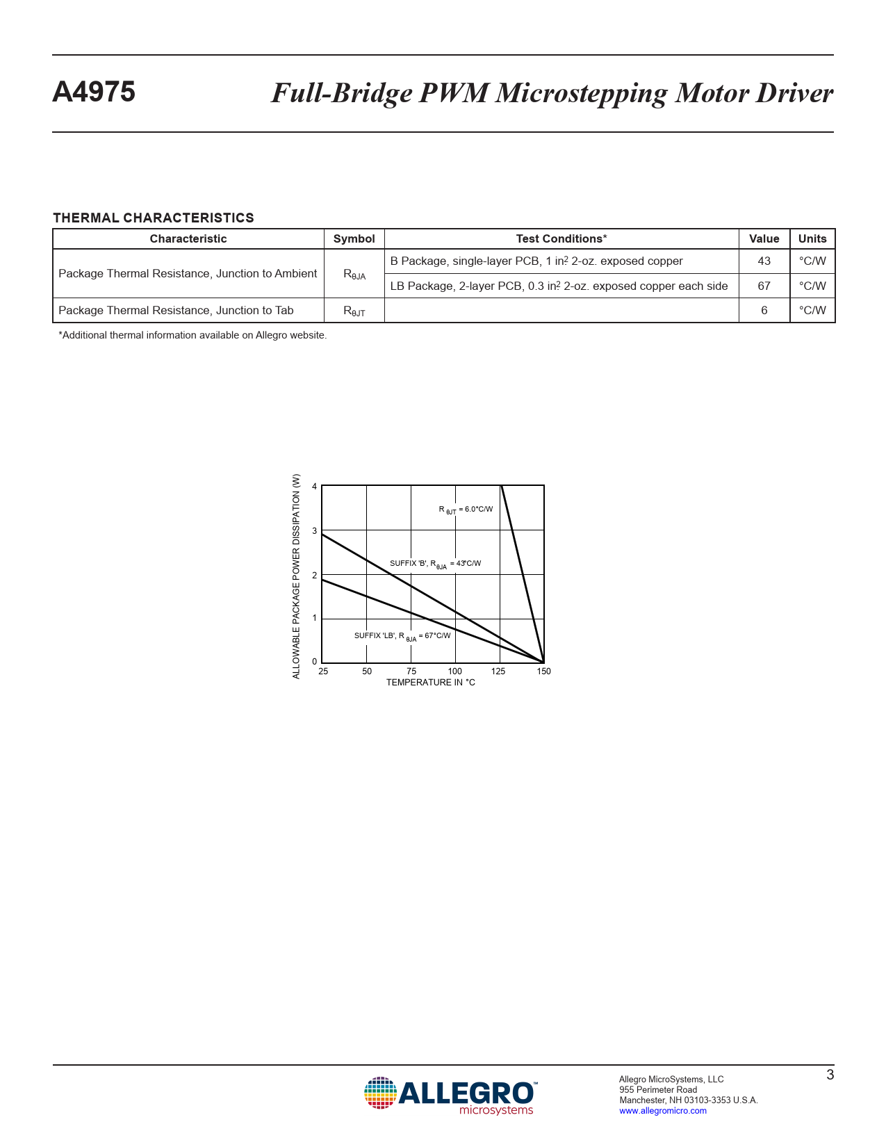 B Package, single-layer PCB, 1 in.2 2-oz. exposed copper 43 °C/W Package Thermal Resistance, Junction to Ambient RθJA LB Package, 2-layer PCB, 0.3 in.2 2-oz. exposed copper each side 67 °C/W Package Thermal Resistance, Junction to Tab RθJT 6 °C/W *Additional thermal information available on Allegro website. 4 R = 6.0°C/W θJT 3 SUFFIX 'B', R = 43°C/W θJA 2 1 SUFFIX 'LB', R = 67°C/W θJA 0 25 50 75 100 125 150 ALLOWABLE PACKAGE POWER DISSIPATION (W) TEMPERATURE IN °C Allegro MicroSystems, LLC 3 955 Perimeter Road Manchester, NH 03103-3353 U.S.A. www.allegromicro.com