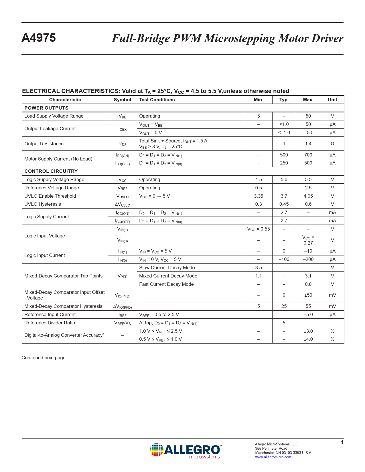 Logic Supply Voltage Range VCC Operating 4.5 5.0 5.5 V Reference Voltage Range VREF Operating 0.5 – 2.5 V UVLO Enable Threshold VUVLO VCC = 0 → 5 V 3.35 3.7 4.05 V UVLO Hysteresis ∆VUVLO 0.3 0.45 0.6 V I Logic Supply Current CC(ON) D0 = D1 = D2 = VIN(1) – 2.7 – mA ICC(OFF) D0 = D1 = D2 = VIN(0) – 2.7 – mA VIN(1) VCC × 0.55 – – V Logic Input Voltage VIN(0) – – VCC × 0.27 V I Logic Input Current IN(1) VIN = VCC = 5 V – 0 –10 µA IIN(0) VIN = 0 V, VCC = 5 V – –106 –200 µA Slow Current Decay Mode 3.5 – – V Mixed-Decay Comparator Trip Points VPFD Mixed Current Decay Mode 1.1 – 3.1 V Fast Current Decay Mode – – 0.8 V Mixed-Decay Comparator Input Offset Voltage VIO(PFD) – 0 ±50 mV Mixed-Decay Comparator Hysteresis ∆VIO(PFD) 5 25 55 mV Reference Input Current IREF VREF = 0.5 to 2.5 V – – ±5.0 µA Reference Divider Ratio VREF/VS At trip, D0 = D1 = D2 = VIN(1) – 5 – – 1.0 V < V Digital-to-Analog Converter Accuracy* – REF ≤ 2.5 V – – ±3.0 % 0.5 V ≤ VREF ≤ 1.0 V – – ±4.0 % Continued next page… Allegro MicroSystems, LLC 4 955 Perimeter Road Manchester, NH 03103-3353 U.S.A. www.allegromicro.com