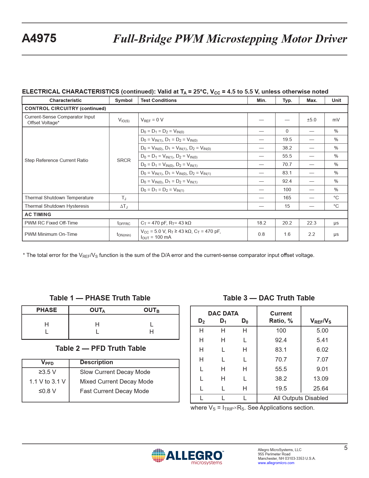 A4975 Full-Bridge PWM Microstepping Motor Driver ELECTRICAL CHARACTERISTICS (continued): Valid at TA = 25°C, VCC = 4.5 to 5.5 V, unless otherwise noted Characteristic Symbol Test Conditions Min. Typ. Max. Unit CONTROL CIRCUITRY (continued)