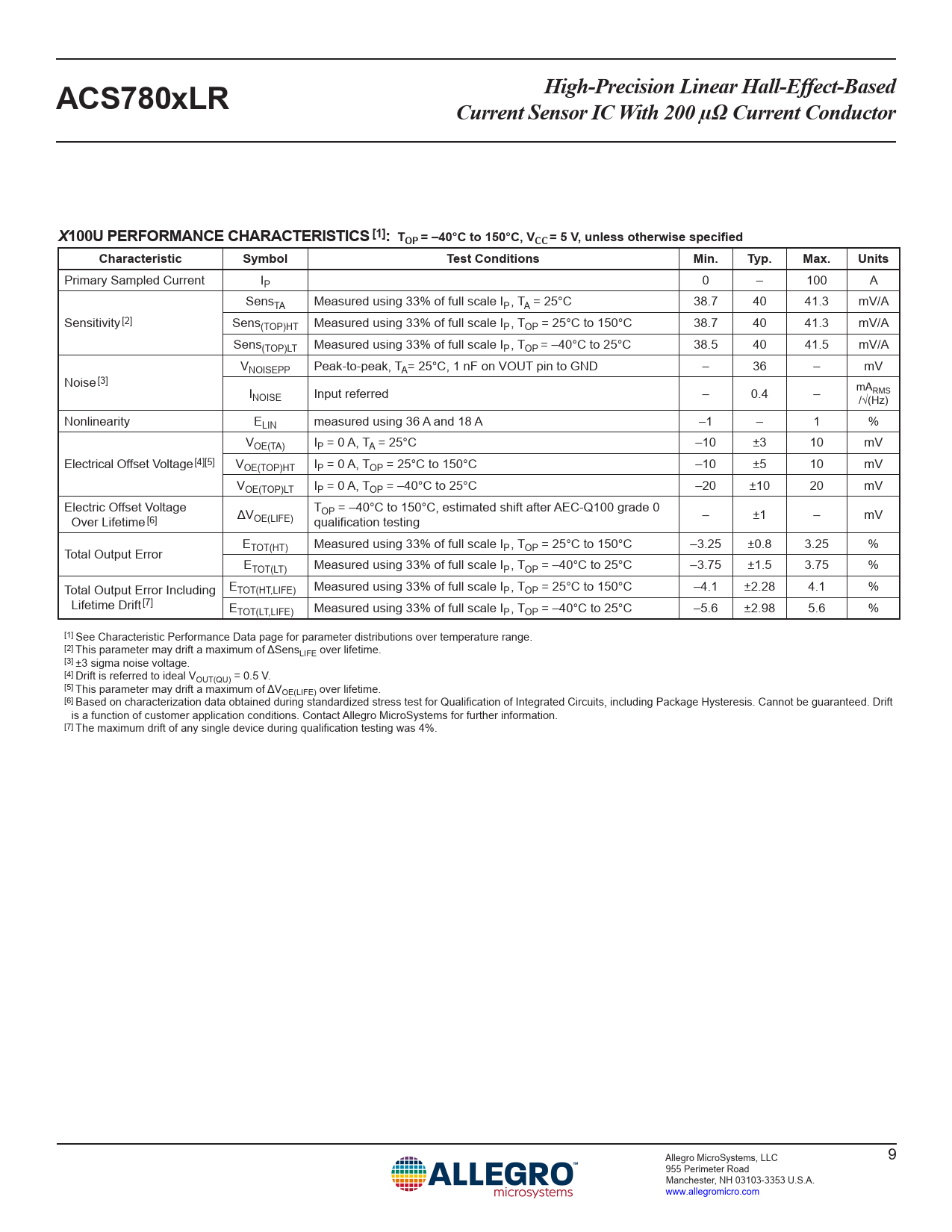 High-Precision Linear Hall-Effect-BasedACS780xLRCurrent Sensor IC With 200 µΩ Current ConductorX100U PERFORMANCE CHARACTERISTICS [1]: TOP = –40°C to 150°C, VCC = 5 V, unless otherwise specifiedCharacteristicSymbolTest ConditionsMin.Typ.Max.Units Primary Sampled Current IP 0 – 100 A SensTA Measured using 33% of full scale IP , TA = 25°C 38.7 40 41.3 mV/A Sensitivity [2] Sens(TOP)HT Measured using 33% of full scale IP , TOP = 25°C to 150°C 38.7 40 41.3 mV/A Sens(TOP)LT Measured using 33% of full scale IP , TOP = –40°C to 25°C 38.5 40 41.5 mV/A VNOISEPP Peak-to-peak, TA= 25°C, 1 nF on VOUT pin to GND – 36 – mV Noise [3] INOISE Input referred – 0.4 – mARMS / √ (Hz) Nonlinearity ELIN measured using 36 A and 18 A –1 – 1 % VOE(TA) IP = 0 A, TA = 25°C –10 ±3 10 mV Electrical Offset Voltage [4][5] VOE(TOP)HT IP = 0 A, TOP = 25°C to 150°C –10 ±5 10 mV VOE(TOP)LT IP = 0 A, TOP = –40°C to 25°C –20 ±10 20 mV Electric Offset Voltage TOP = –40°C to 150°C, estimated shift after AEC-Q100 grade 0 Over Lifetime [6] ΔVOE(LIFE) qualification testing – ±1 – mV E Total Output Error TOT(HT) Measured using 33% of full scale IP , TOP = 25°C to 150°C –3.25 ±0.8 3.25 % ETOT(LT) Measured using 33% of full scale IP , TOP = –40°C to 25°C –3.75 ±1.5 3.75 % Total Output Error Including ETOT(HT,LIFE) Measured using 33% of full scale IP , TOP = 25°C to 150°C –4.1 ±2.28 4.1 % Lifetime Drift [7] ETOT(LT,LIFE) Measured using 33% of full scale IP , TOP = –40°C to 25°C –5.6 ±2.98 5.6 % [1] See Characteristic Performance Data page for parameter distributions over temperature range. [2] This parameter may drift a maximum of ΔSensLIFE over lifetime. [3] ±3 sigma noise voltage. [4] Drift is referred to ideal VOUT(QU) = 0.5 V. [5] This parameter may drift a maximum of ΔVOE(LIFE) over lifetime. [6] Based on characterization data obtained during standardized stress test for Qualification of Integrated Circuits, including Package Hysteresis. Cannot be guaranteed. Drift is a function of customer application conditions. Contact Allegro MicroSystems for further information. [7] The maximum drift of any single device during qualification testing was 4%. Allegro MicroSystems, LLC 9 955 Perimeter Road Manchester, NH 03103-3353 U.S.A. www.allegromicro.com
