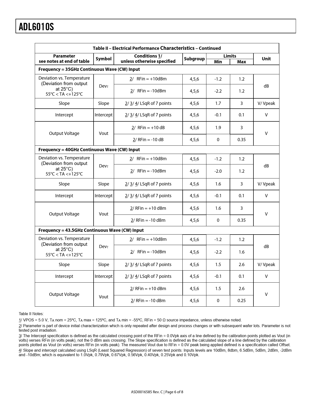 ADL6010STable II – Electrical Performance Characteristics – ContinuedParameterConditions 1/LimitsSymbolSubgroupUnitsee notes at end of tableunless otherwise specifiedMinMaxFrequency = 35GHz Continuous Wave (CW) Input Deviation vs. Temperature 2/ RFin = +10dBm 4,5,6 -1.2 1.2 (Deviation from output at 25°C) DevT dB 2/ RFin = -10dBm 4,5,6 -2.2 1.2 55°C < TA <+125°C Slope Slope 2/ 3/ 4/ LSqR of 7 points 4,5,6 1.7 3 V/ Vpeak Intercept Intercept 2/ 3/ 4/ LSqR of 7 points 4,5,6 -0.1 0.1 V 2/ RFin = +10 dB 4,5,6 1.9 3 Output Voltage Vout V 2/ RFin = -10 dB 4,5,6 0 0.35 Frequency = 40GHz Continuous Wave (CW) Input Deviation vs. Temperature 2/ RFin = +10dBm 4,5,6 -1.2 1.2 (Deviation from output at 25°C) DevT dB 2/ RFin = -10dBm 4,5,6 -2.0 1.2 55°C < TA <+125°C Slope Slope 2/ 3/ 4/ LSqR of 7 points 4,5,6 1.6 3 V/ Vpeak Intercept Intercept 2/ 3/ 4/ LSqR of 7 points 4,5,6 -0.1 0.1 V 2/ RFin = +10 dBm 4,5,6 1.6 3 Output Voltage Vout V 2/ RFin = -10 dBm 4,5,6 0 0.35 Frequency = 43.5GHz Continuous Wave (CW) Input Deviation vs. Temperature 2/ RFin = +10dBm 4,5,6 -1.2 1.2 (Deviation from output at 25°C) DevT dB 2/ RFin = -10dBm 4,5,6 -2.2 1.6 55°C < TA <+125°C Slope Slope 2/ 3/ 4/ LSqR of 7 points 4,5,6 1.5 2.6 V/ Vpeak Intercept Intercept 2/ 3/ 4/ LSqR of 7 points 4,5,6 -0.1 0.1 V 2/ RFin = +10 dBm 4,5,6 1.5 2.6 Output Voltage V Vout 2/ RFin = -10 dBm 4,5,6 0 0.25 Table II Notes: 1/ VPOS = 5.0 V, TA nom = 25ºC, TA max = 125ºC, and TA min = -55ºC, RFin = 50 Ω source impedance, unless otherwise noted. 2/ Parameter is part of device initial characterization which is only repeated after design and process changes or with subsequent wafer lots. Parameter is not tested post irradiation. 3/ The Intercept specification is defined as the calculated crossing point of the RFin = 0.0Vpk axis of a line defined by the calibration points plotted as Vout (in volts) verses RFin (in volts peak), not the 0 dBm axis crossing. The Slope specification is defined as the calculated slope of a line defined by the calibration points plotted as Vout (in volts) verses RFin (in volts peak). The measured Vout due to RFin = 0.0V peak being applied defined is a specification called Offset. 4/ Slope and intercept calculated using LSqR (Least Squared Regression) of seven test points: Inputs levels are 10dBm, 8dbm, 6.5dBm, 5dBm, 2dBm, -2dBm and -10dBm; which is equivalent to 1.0Vpk, 0.79Vpk, 0.67Vpk, 0.56Vpk, 0.40Vpk, 0.25Vpk and 0.10Vpk. ASD0016585 Rev. C | Page 6 of 8