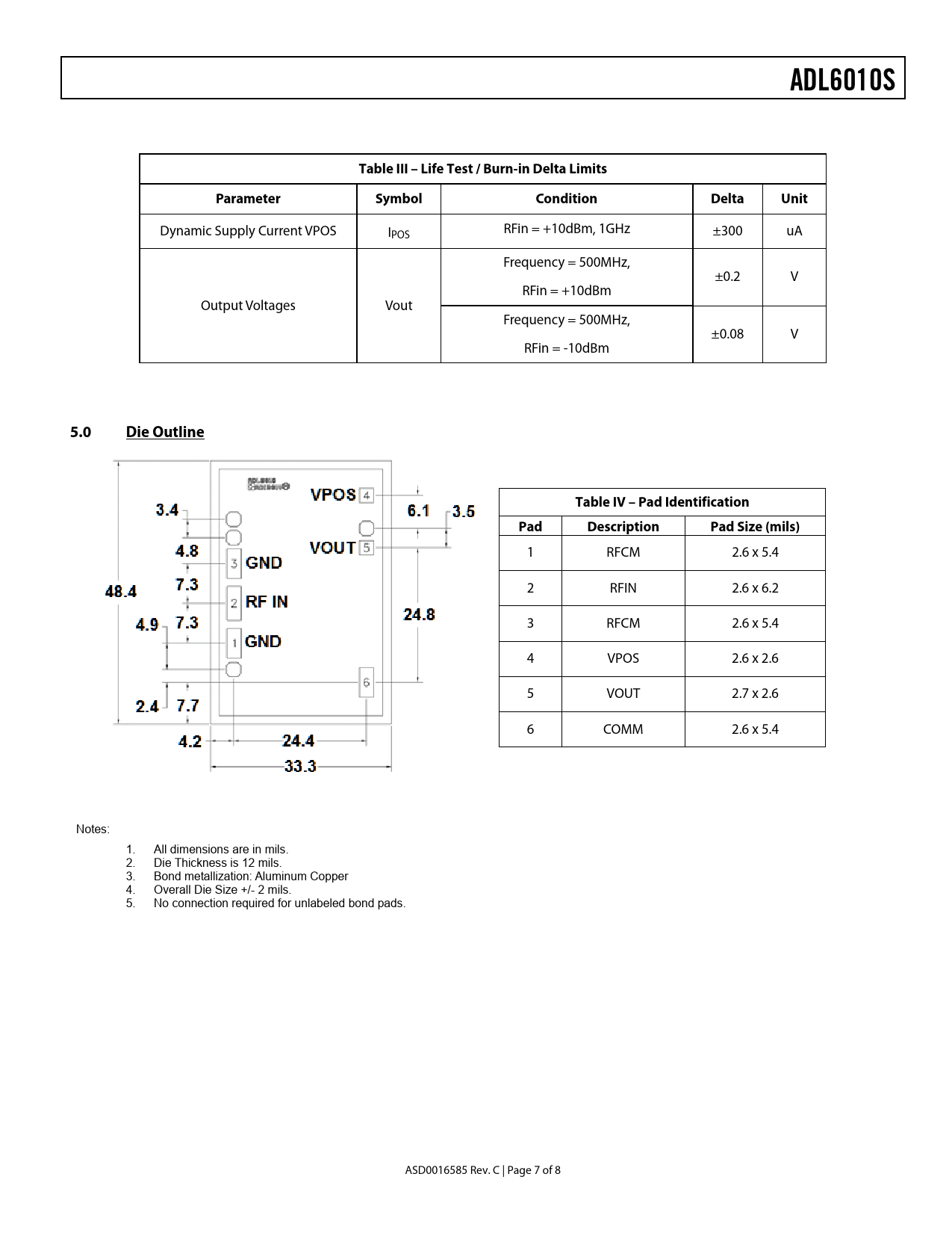 ADL6010STable III – Life Test / Burn-in Delta LimitsParameter SymbolConditionDeltaUnit Dynamic Supply Current VPOS I RFin = +10dBm, 1GHz POS ±300 uA Frequency = 500MHz, ±0.2 V RFin = +10dBm Output Voltages Vout Frequency = 500MHz, ±0.08 V RFin = -10dBm 5.0Die OutlineTable IV – Pad IdentificationPadDescriptionPad Size (mils) 1 RFCM 2.6 x 5.4 2 RFIN 2.6 x 6.2 3 RFCM 2.6 x 5.4 4 VPOS 2.6 x 2.6 5 VOUT 2.7 x 2.6 6 COMM 2.6 x 5.4 Notes: 1. All dimensions are in mils. 2. Die Thickness is 12 mils. 3. Bond metallization: Aluminum Copper 4. Overall Die Size +/- 2 mils. 5. No connection required for unlabeled bond pads. ASD0016585 Rev. C | Page 7 of 8