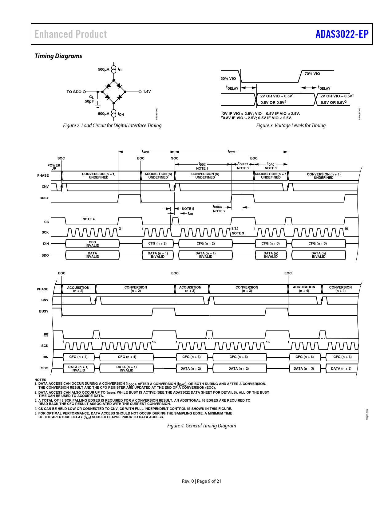 Enhanced ProductADAS3022-EPTiming Diagrams500µAIOL70% VIO30% VIOtDELAYtDELAYTO SDO1.4VC2V OR VIO – 0.5V12V OR VIO – 0.5V1L50pF0.8V OR 0.5V20.8V OR 0.5V2 03 0 500µAI -002 1OH2V IF VIO > 2.5V; VIO – 0.5V IF VIO < 2.5V. 3- 983 2 598 15 0.8V IF VIO > 2.5V; 0.5V IF VIO < 2.5V. 1 Figure 2. Load Circuit for Digital Interface Timing Figure 3. Voltage Levels for Timing ttACQCYCSOCEOCSOCEOCttPOWERDDCQUIETtDACUPNOTE 1NOTE 2NOTE 1CONVERSION (n – 1)ACQUISITION (n)CONVERSION (n)ACQUISITION (n + 1)PHASECONVERSION (n + 1)UNDEFINEDUNDEFINEDUNDEFINEDUNDEFINEDUNDEFINEDCNVBUSYtNOTE 5DDCANOTE 2tADNOTE 4CSX116/32116SCKNOTE 3CFGDINCFG (n + 2)CFG (n + 2)CFG (n + 3)CFG (n + 3)INVALIDDATADATA (n – 1)DATA (n – 1)DATA (n)DATA (n)SDOINVALIDINVALIDINVALIDINVALIDINVALIDEOCEOCEOCACQUISITIONCONVERSIONACQUISITIONCONVERSIONACQUISITIONCONVERSIONPHASE(n + 2)(n + 2)(n + 3)(n + 3)(n + 4)(n + 4)CNVBUSYCS1161161SCKDINCFG (n + 4)CFG (n + 4)CFG (n + 5)CFG (n + 5)CFG (n + 6)CFG (n + 6)DATA (n + 1)SDODATA (n + 1)DATA (n + 2)DATA (n + 2)DATA (n + 3)DATA (n + 3)INVALIDINVALIDNOTES 1. DATA ACCESS CAN OCCUR DURING A CONVERSION ( tDDC), AFTER A CONVERSION (tDAC), OR BOTH DURING AND AFTER A CONVERSION. THE CONVERSION RESULT AND THE CFG REGISTER ARE UPDATED AT THE END OF A CONVERSION (EOC).2. DATA ACCESS CAN ALSO OCCUR UP TO tDDCA WHILE BUSY IS ACTIVE (SEE THE ADAS3022 DATA SHEET FOR DETAILS). ALL OF THE BUSYTIME CAN BE USED TO ACQUIRE DATA.3. A TOTAL OF 16 SCK FALLING EDGES IS REQUIRED FOR A CONVERSION RESULT. AN ADDITIONAL 16 EDGES ARE REQUIRED TO READ BACK THE CFG RESULT ASSOCIATED WITH THE CURRENT CONVERSION.4. CS CAN BE HELD LOW OR CONNECTED TO CNV. CS WITH FULL INDEPENDENT CONTROL IS SHOWN IN THIS FIGURE. 5. FOR OPTIMAL PERFORMANCE, DATA ACCESS SHOULD NOT OCCUR DURING THE SAMPLING EDGE. A MINIMUM TIME 028 83- OF THE APERTURE DELAY (tAD) SHOULD ELAPSE PRIOR TO DATA ACCESS. 159 Figure 4. General Timing Diagram Rev. 0 | Page 9 of 21 Document Outline Features Enhanced Features Applications General Description Table of Contents Revision History Functional Block Diagram Specifications Timing Specifications Timing Diagrams Absolute Maximum Ratings ESD Caution Pin Configuration and Function Descriptions Typical Performance Characteristics Outline Dimensions Ordering Guide