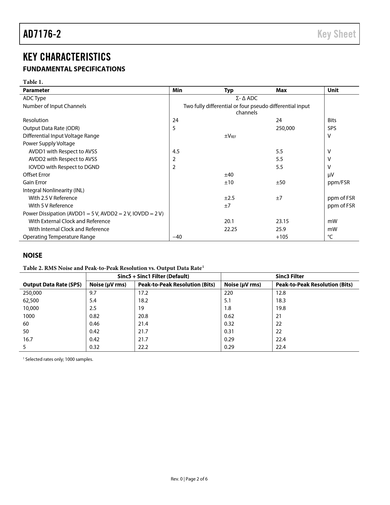 link to page 2 AD7176-2Key SheetKEY CHARACTERISTICS FUNDAMENTAL SPECIFICATIONSTable 1. ParameterMinTypMaxUnit ADC Type Σ- Δ ADC Number of Input Channels Two fully differential or four pseudo differential input channels Resolution 24 24 Bits Output Data Rate (ODR) 5 250,000 SPS Differential Input Voltage Range ±VREF V Power Supply Voltage AVDD1 with Respect to AVSS 4.5 5.5 V AVDD2 with Respect to AVSS 2 5.5 V IOVDD with Respect to DGND 2 5.5 V Offset Error ±40 µV Gain Error ±10 ±50 ppm/FSR Integral Nonlinearity (INL) With 2.5 V Reference ±2.5 ±7 ppm of FSR With 5 V Reference ±7 ppm of FSR Power Dissipation (AVDD1 = 5 V, AVDD2 = 2 V, IOVDD = 2 V) With External Clock and Reference 20.1 23.15 mW With Internal Clock and Reference 22.25 25.9 mW Operating Temperature Range −40 +105 °C NOISETable 2. RMS Noise and Peak-to-Peak Resolution vs. Output Data Rate1Sinc5 + Sinc1 Filter (Default)Sinc3 FilterOutput Data Rate (SPS)Noise (µV rms)Peak-to-Peak Resolution (Bits)Noise (µV rms)Peak-to-Peak Resolution (Bits) 250,000 9.7 17.2 220 12.8 62,500 5.4 18.2 5.1 18.3 10,000 2.5 19 1.8 19.8 1000 0.82 20.8 0.62 21 60 0.46 21.4 0.32 22 50 0.42 21.7 0.31 22 16.7 0.42 21.7 0.29 22.4 5 0.32 22.2 0.29 22.4 1 Selected rates only; 1000 samples. Rev. 0 | Page 2 of 6 Document Outline General Description Features and Benefits Key Characteristics Fundamental Specifications Noise Operating the AD7176-2 Data Interface Accessing the ADC Register Map ADC and Interface Mode Configuration ADC Mode Register Interface Mode Register Data Modes Continuous Conversion Mode (Default) Continuous Read Mode Single Conversion Mode Typical Application Diagram Frequently Asked Questions Learn More and Start Designing Compatible Devices Package Diagram Getting Started