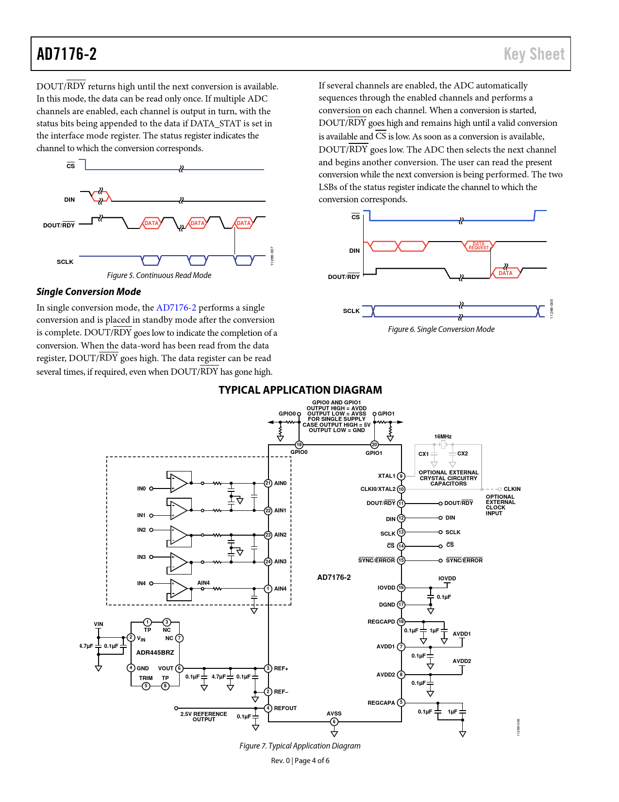 AD7176-2Key Sheet DOUT/RDY returns high until the next conversion is available. If several channels are enabled, the ADC automatical y In this mode, the data can be read only once. If multiple ADC sequences through the enabled channels and performs a channels are enabled, each channel is output in turn, with the conversion on each channel. When a conversion is started, status bits being appended to the data if DATA_STAT is set in DOUT/RDY goes high and remains high until a valid conversion the interface mode register. The status register indicates the is available and CS is low. As soon as a conversion is available, channel to which the conversion corresponds. DOUT/RDY goes low. The ADC then selects the next channel CS and begins another conversion. The user can read the present conversion while the next conversion is being performed. The two LSBs of the status register indicate the channel to which the DIN conversion corresponds. CSDOUT/RDYDATADATADATADATAREQUEST 007 DINSCLK 11266- Figure 5. Continuous Read Mode DATADOUT/RDYSingle Conversion Mode In single conversion mode, the AD7176-2 performs a single 005 SCLK conversion and is placed in standby mode after the conversion 11266- is complete. DOUT/RDY goes low to indicate the completion of a Figure 6. Single Conversion Mode conversion. When the data-word has been read from the data register, DOUT/RDY goes high. The data register can be read several times, if required, even when DOUT/RDY has gone high. TYPICAL APPLICATION DIAGRAMGPIO0 AND GPIO1OUTPUT HIGH = AVDDGPIO0OUTPUT LOW = AVSSGPIO1FOR SINGLE SUPPLYCASE OUTPUT HIGH = 5VOUTPUT LOW = GND16MHz1920GPIO0GPIO1CX1CX2OPTIONAL EXTERNALXTAL1 9CRYSTAL CIRCUITRY21 AIN0CAPACITORSIN0CLKI0/XTAL2 10CLKINOPTIONALDOUT/RDY 11DOUT/RDYEXTERNAL CLOCK22 AIN1INPUTIN112DINDININ213SCLK23 AIN2SCLKCS 14CSIN324 AIN3SYNC/ERROR 15SYNC/ERRORAD7176-2IOVDDIN4AIN41IOVDD 16AIN40.1µFDGND 1713REGCAPD 18VINTPNC0.1µF1µFAVDD12VNC 7IN4.7µF0.1µFAVDD1 7ADR445BRZ0.1µFAVDD24GNDVOUT 63REF+AVDD2 80.1µF4.7µF0.1µFTRIMTP0.1µF582REF–REGCAPA 54REFOUT2.5V REFERENCEAVSS0.1µF1µF0.1µFOUTPUT6 006 11266- Figure 7. Typical Application Diagram Rev. 0 | Page 4 of 6 Document Outline General Description Features and Benefits Key Characteristics Fundamental Specifications Noise Operating the AD7176-2 Data Interface Accessing the ADC Register Map ADC and Interface Mode Configuration ADC Mode Register Interface Mode Register Data Modes Continuous Conversion Mode (Default) Continuous Read Mode Single Conversion Mode Typical Application Diagram Frequently Asked Questions Learn More and Start Designing Compatible Devices Package Diagram Getting Started