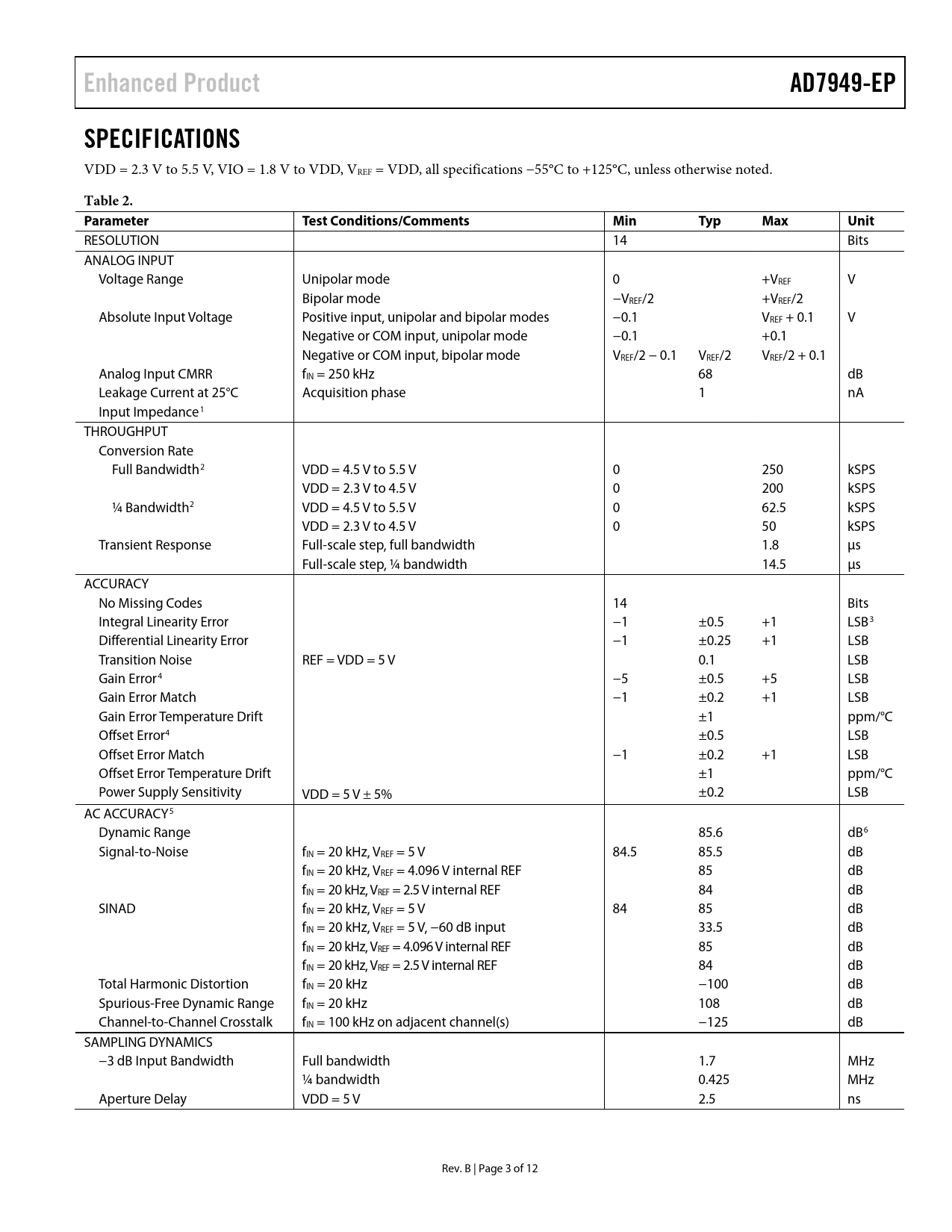Enhanced Product. AD7949-EP. SPECIFICATIONS. Table 2. Parameter. Test Conditions/Comments. Min. Typ. Max. Unit