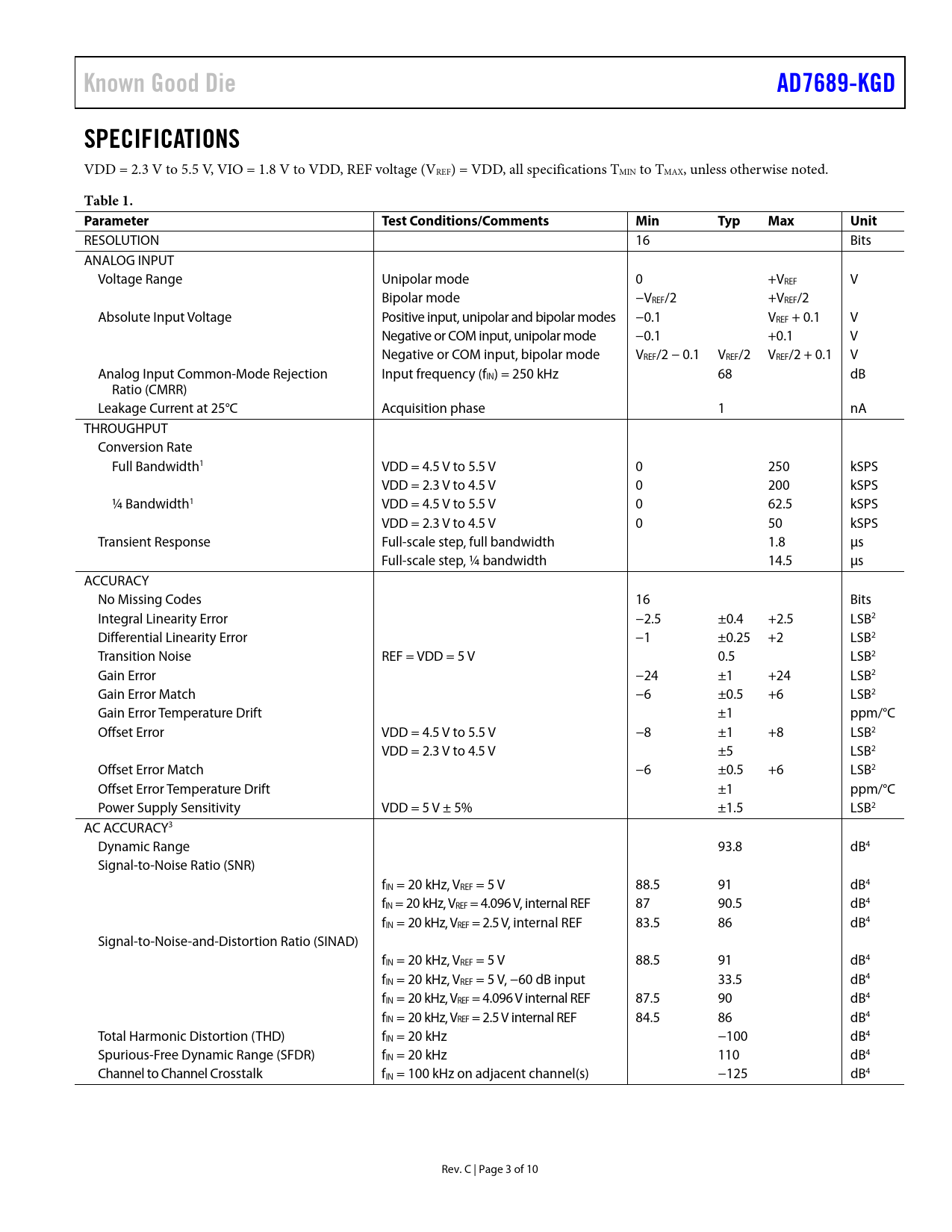 Known Good Die AD7689-KGD SPECIFICATIONS Table 1 Parameter Test Conditions/Comments Min Typ Max Unit