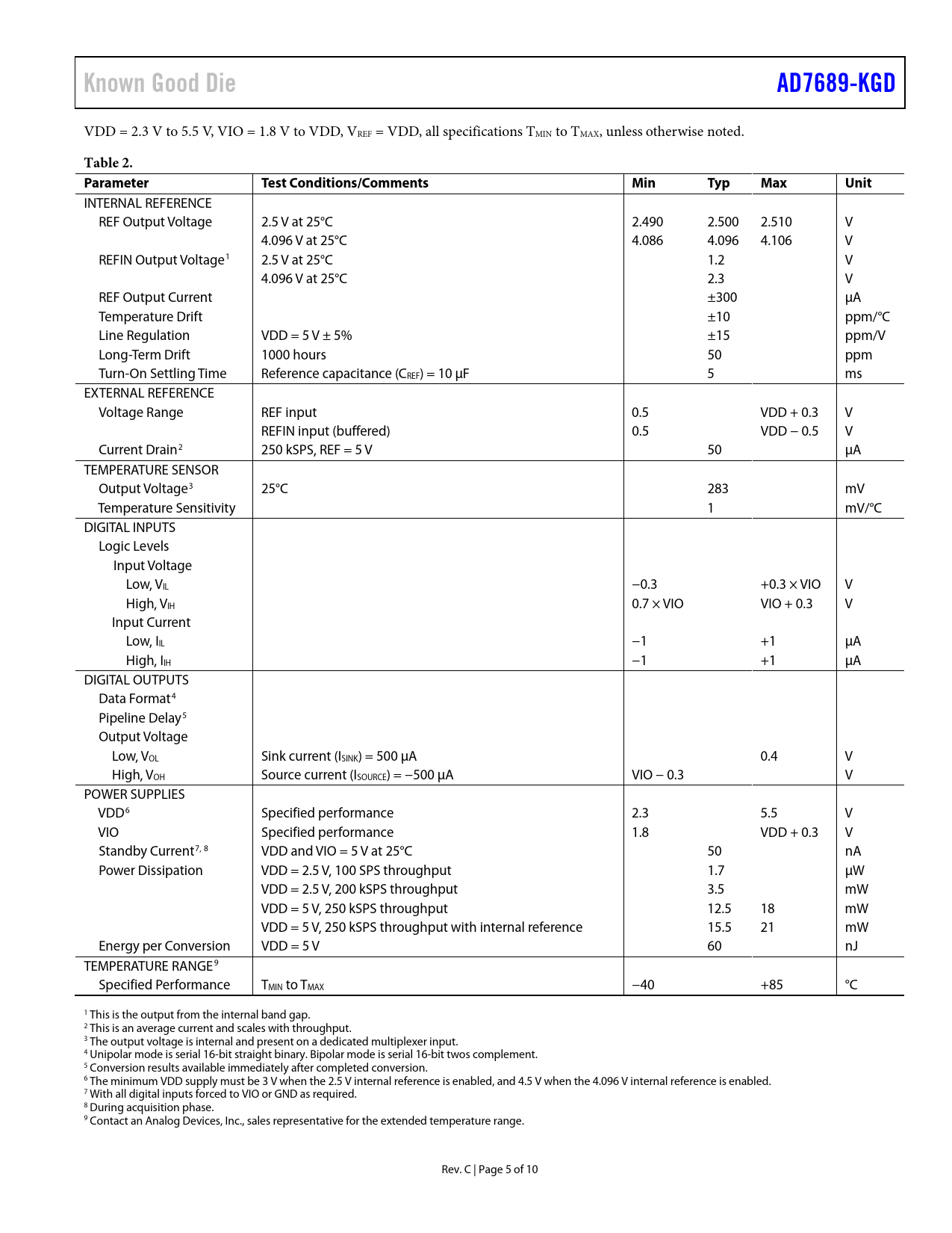 Seiten / Seite10 / 5 — Known Good Die. AD7689-KGD. Table 2. Parameter. Test Conditions/Comments. …