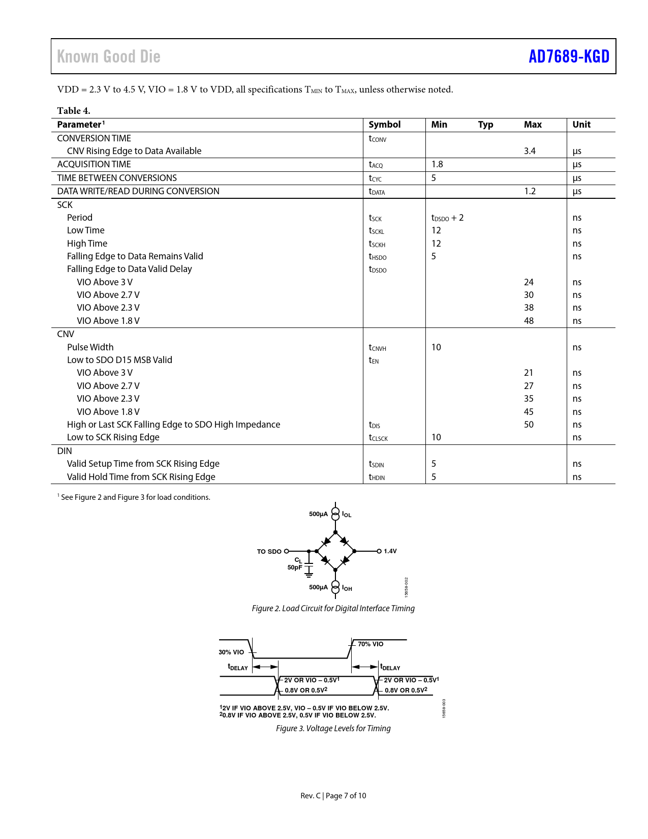 Known Good Die AD7689-KGD Table 4 Parameter1 Symbol Min Typ Max Unit 500µA IOL TO SDO 1.4V 50pF IOH 70% VIO 30% VIO tDELAY