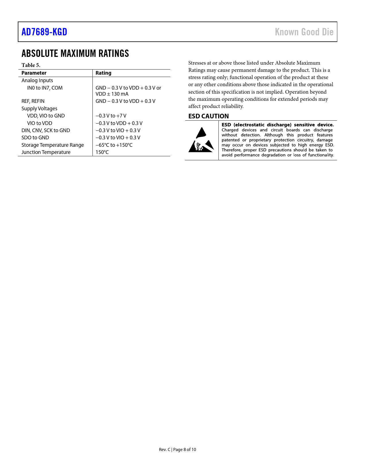 Seiten / Seite10 / 8 — AD7689-KGD. Known Good Die. ABSOLUTE MAXIMUM RATINGS Table 5. Parameter. …