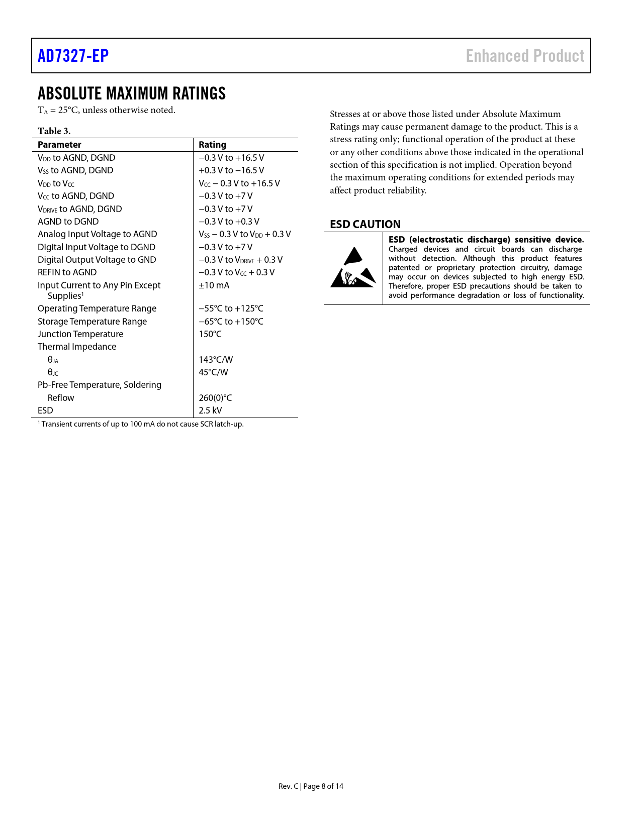 AD7327-EP. Enhanced Product. ABSOLUTE MAXIMUM RATINGS. Table 3. Parameter. Rating. ESD CAUTION