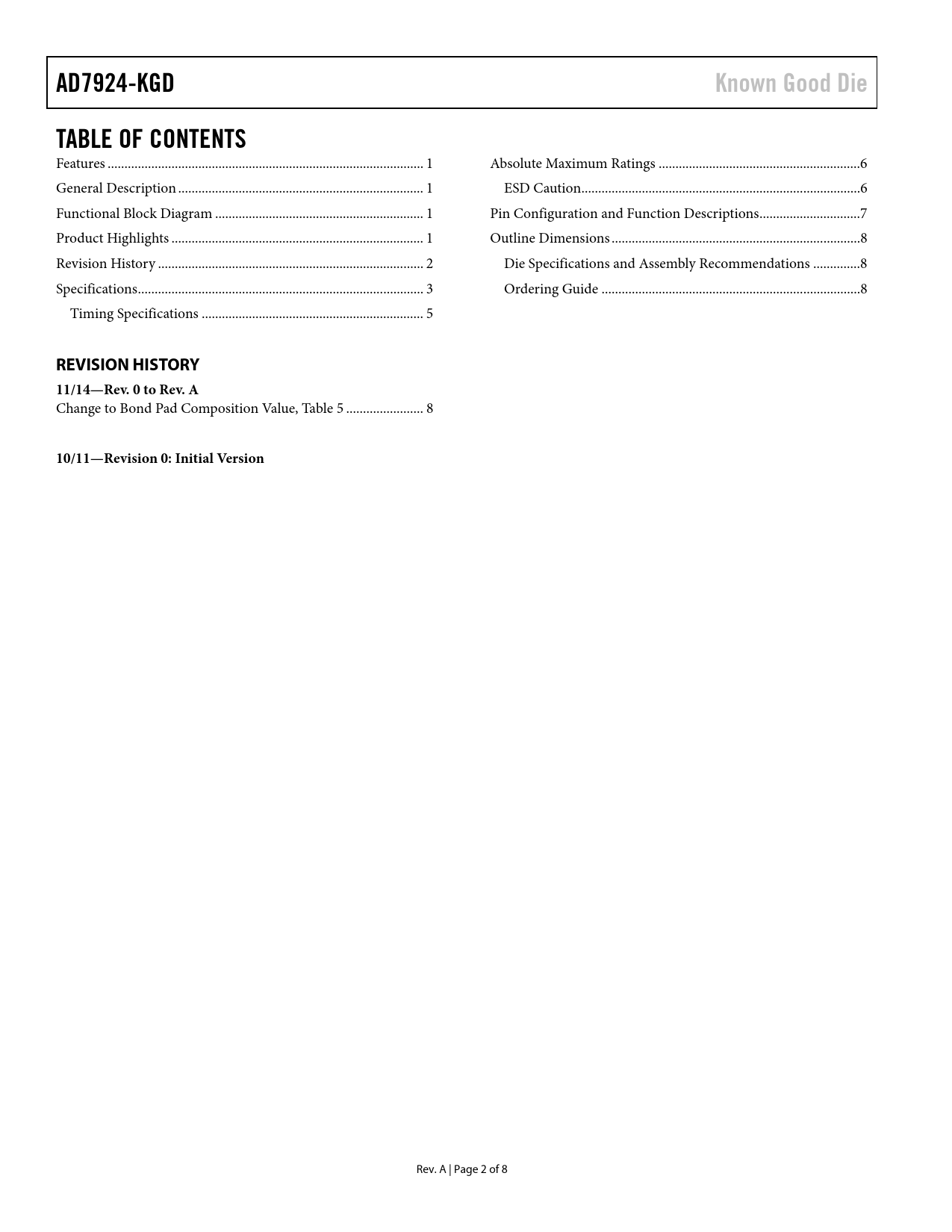 Seiten / Seite8 / 2 — AD7924-KGD. Known Good Die. TABLE OF CONTENTS. REVISION HISTORY …