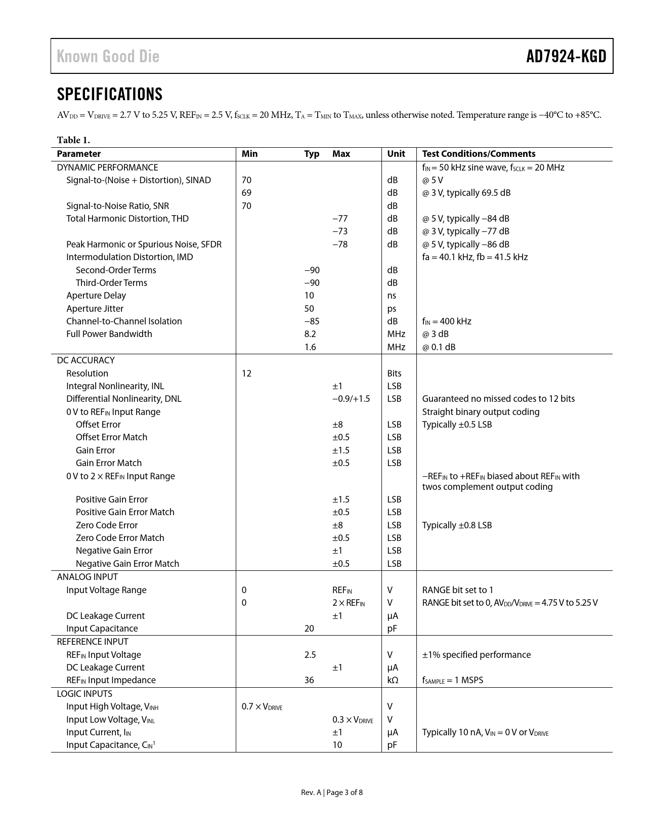 link to page 4 Known Good DieAD7924-KGDSPECIFICATIONS AVDD = VDRIVE = 2.7 V to 5.25 V, REFIN = 2.5 V, fSCLK = 20 MHz, TA = TMIN to TMAX, unless otherwise noted. Temperature range is −40°C to +85°C. Table 1. ParameterMinTyp MaxUnitTest Conditions/Comments DYNAMIC PERFORMANCE fIN = 50 kHz sine wave, fSCLK = 20 MHz Signal-to-(Noise + Distortion), SINAD 70 dB @ 5 V 69 dB @ 3 V, typically 69.5 dB Signal-to-Noise Ratio, SNR 70 dB Total Harmonic Distortion, THD −77 dB @ 5 V, typically −84 dB −73 dB @ 3 V, typically −77 dB Peak Harmonic or Spurious Noise, SFDR −78 dB @ 5 V, typically −86 dB Intermodulation Distortion, IMD fa = 40.1 kHz, fb = 41.5 kHz Second-Order Terms −90 dB Third-Order Terms −90 dB Aperture Delay 10 ns Aperture Jitter 50 ps Channel-to-Channel Isolation −85 dB fIN = 400 kHz Full Power Bandwidth 8.2 MHz @ 3 dB 1.6 MHz @ 0.1 dB DC ACCURACY Resolution 12 Bits Integral Nonlinearity, INL ±1 LSB Differential Nonlinearity, DNL −0.9/+1.5 LSB Guaranteed no missed codes to 12 bits 0 V to REFIN Input Range Straight binary output coding Offset Error ±8 LSB Typically ±0.5 LSB Offset Error Match ±0.5 LSB Gain Error ±1.5 LSB Gain Error Match ±0.5 LSB 0 V to 2 × REFIN Input Range −REFIN to +REFIN biased about REFIN with twos complement output coding Positive Gain Error ±1.5 LSB Positive Gain Error Match ±0.5 LSB Zero Code Error ±8 LSB Typically ±0.8 LSB Zero Code Error Match ±0.5 LSB Negative Gain Error ±1 LSB Negative Gain Error Match ±0.5 LSB ANALOG INPUT Input Voltage Range 0 REFIN V RANGE bit set to 1 0 2 × REFIN V RANGE bit set to 0, AVDD/VDRIVE = 4.75 V to 5.25 V DC Leakage Current ±1 μA Input Capacitance 20 pF REFERENCE INPUT REFIN Input Voltage 2.5 V ±1% specified performance DC Leakage Current ±1 μA REFIN Input Impedance 36 kΩ fSAMPLE = 1 MSPS LOGIC INPUTS Input High Voltage, VINH 0.7 × VDRIVE V Input Low Voltage, VINL 0.3 × VDRIVE V Input Current, IIN ±1 μA Typically 10 nA, VIN = 0 V or VDRIVE Input Capacitance, C 1 IN 10 pF Rev. A | Page 3 of 8 Document Outline FEATURES GENERAL DESCRIPTION FUNCTIONAL BLOCK DIAGRAM PRODUCT HIGHLIGHTS TABLE OF CONTENTS REVISION HISTORY SPECIFICATIONS TIMING SPECIFICATIONS ABSOLUTE MAXIMUM RATINGS ESD CAUTION PIN CONFIGURATION AND FUNCTION DESCRIPTIONS OUTLINE DIMENSIONS DIE SPECIFICATIONS AND ASSEMBLY RECOMMENDATIONS ORDERING GUIDE