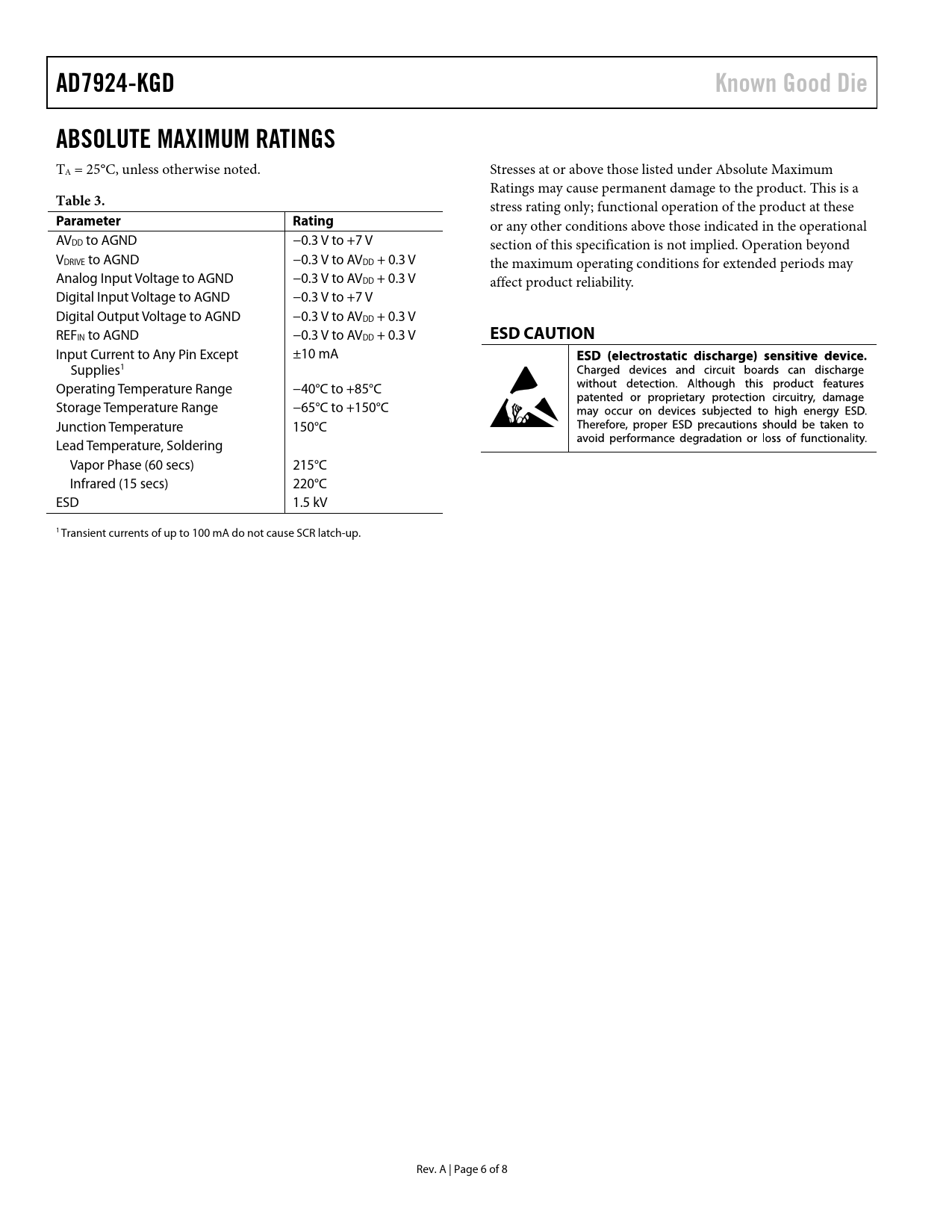 AD7924-KGD. Known Good Die. ABSOLUTE MAXIMUM RATINGS. Table 3. Parameter. Rating. ESD CAUTION