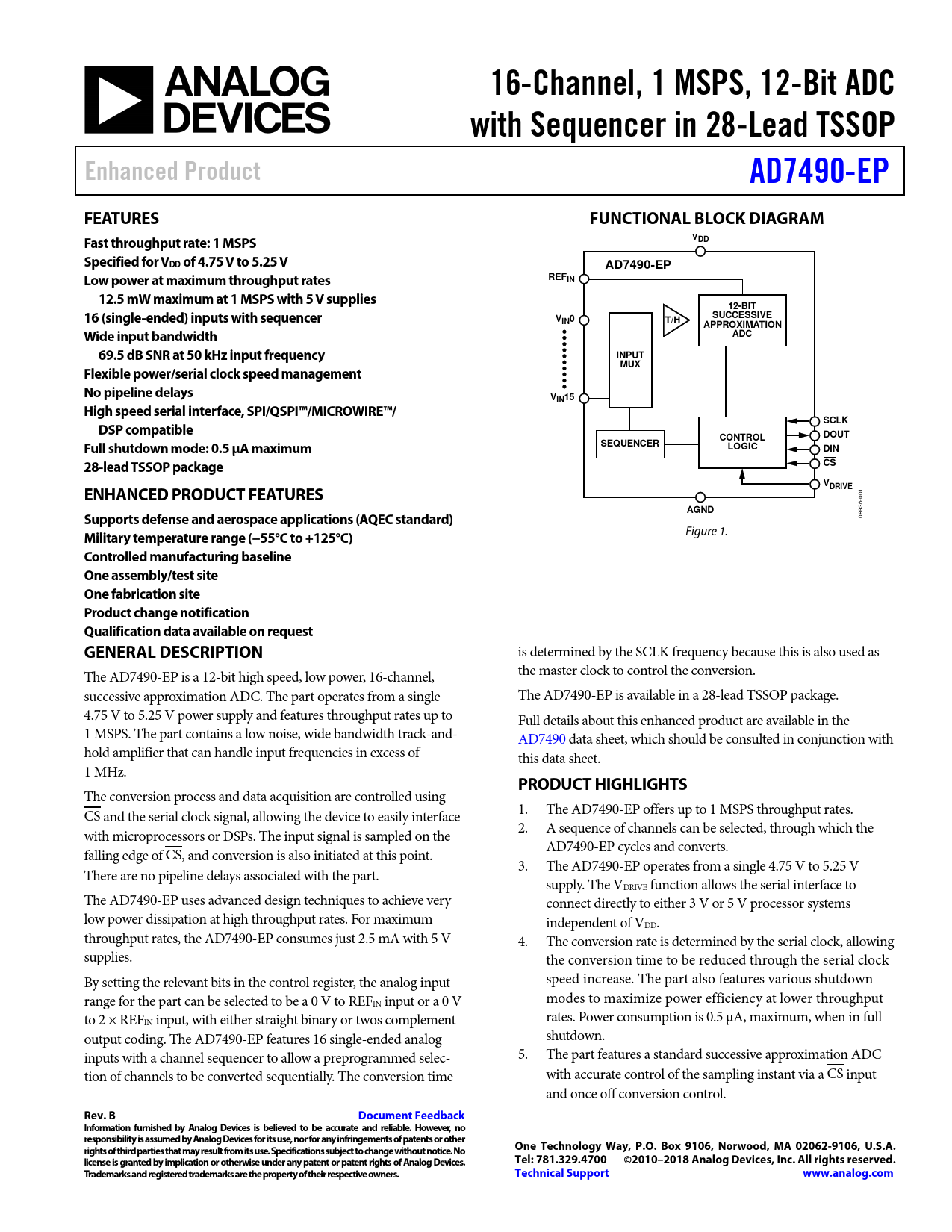 16-Channel, 1 MSPS, 12-Bit ADC. with Sequencer in 28-Lead TSSOP. Enhanced Product. AD7490-EP. FEATURES. FUNCTIONAL BLOCK DIAGRAM