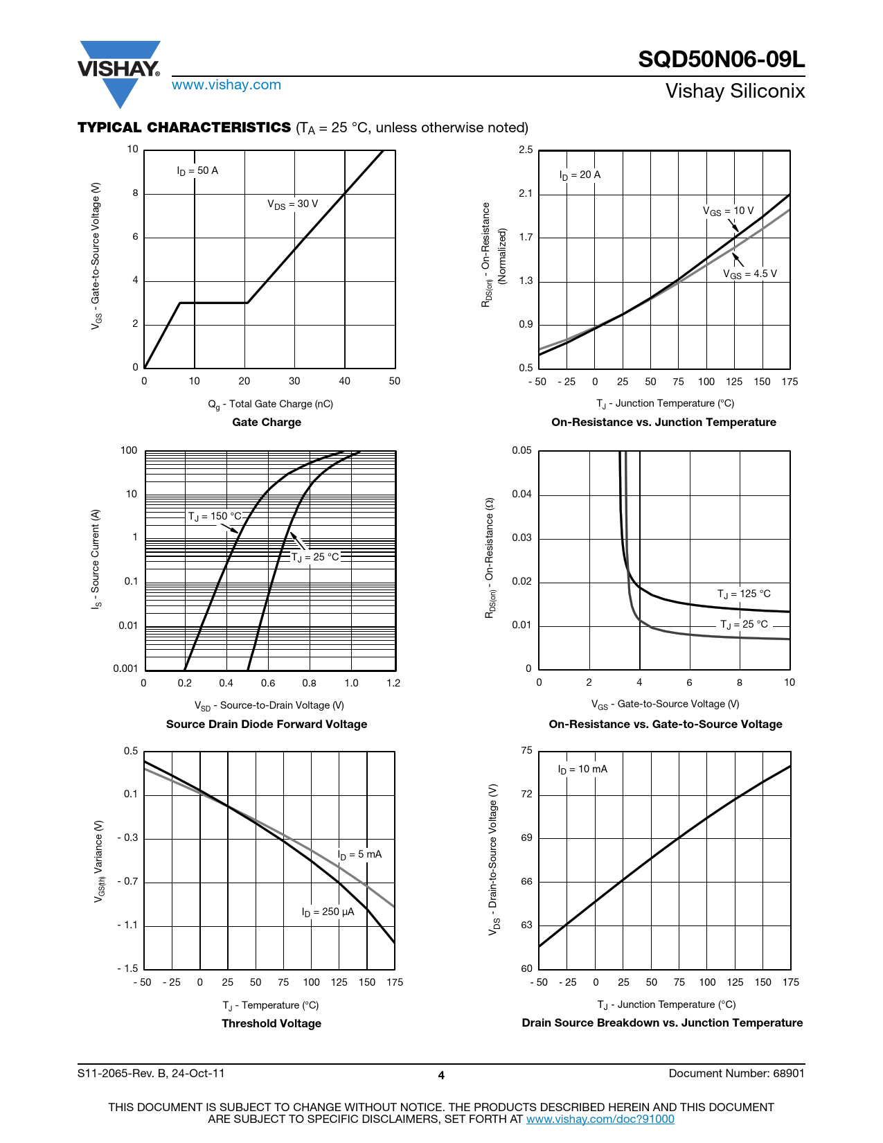 SQD50N06-09L www.vishay.com Vishay Siliconix TYPICAL CHARACTERISTICS (TA = 25 °C, unless otherwise noted) 10 2.5 ID = 50 A ID = 20 A 8 2.1 VDS = 30 V VGS = 10 V tance is 6 s 1.7 ource Voltage (V) S V 4 - On-Re (Normalized) 1.3 GS = 4.5 V ate-to- (on) S G DR - GS 2 V 0.9 0 0.5 0 10 20 30 40 50 - 50 - 25 0 25 50 75 100 125 150 175 Q - Total Gate Charge (nC) T - Junction Temperature (°C) g J Gate ChargeOn-Resistance vs. Junction Temperature 100 0.05 10 0.04 ) Ω TJ = 150 °C 1 tance ( 0.03 is s TJ = 25 °C ource Current (A) 0.1 0.02 S - On-Re T - J = 125 °C (on) I S S DR 0.01 0.01 TJ = 25 °C 0.001 0 0 0.2 0.4 0.6 0.8 1.0 1.2 0 2 4 6 8 10 V - Source-to-Drain Voltage (V) V - Gate-to-Source Voltage (V) SD GS Source Drain Diode Forward VoltageOn-Resistance vs. Gate-to-Source Voltage 0.5 75 ID = 10 mA ) 0.1 (V 72 oltage V - 0.3 69 ID = 5 mA Variance (V) -Source (th) - 0.7 -to 66 GSV Drain ID = 250 μA - - 1.1 DS 63 V - 1.5 60 - 50 - 25 0 25 50 75 100 125 150 175 - 50 - 25 0 25 50 75 100 125 150 175 T - Temperature (°C) T J J - Junction Temperature (°C) Threshold VoltageDrain Source Breakdown vs. Junction Temperature S11-2065-Rev. B, 24-Oct-11 4 Document Number: 68901 THIS DOCUMENT IS SUBJECT TO CHANGE WITHOUT NOTICE. THE PRODUCTS DESCRIBED HEREIN AND THIS DOCUMENT ARE SUBJECT TO SPECIFIC DISCLAIMERS, SET FORTH AT www.vishay.com/doc?91000