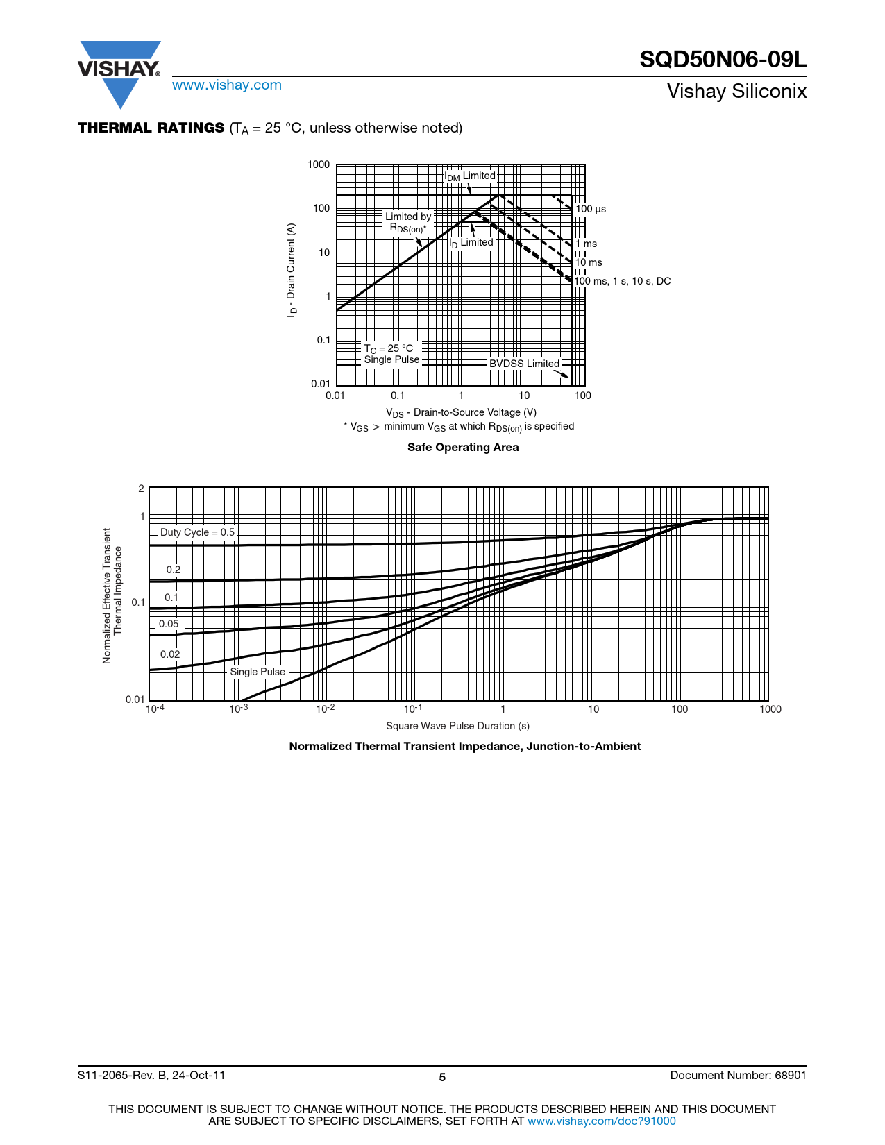 SQD50N06-09L www.vishay.com Vishay Siliconix THERMAL RATINGS (TA = 25 °C, unless otherwise noted) 1000 IDM Limited 100 100 µs Limited by RDS(on)* ID Limited 1 ms 10 10 ms 100 ms, 1 s, 10 s, DC 1 - Drain Current (A) I D 0.1 TC = 25 °C Single Pulse BVDSS Limited 0.01 0.01 0.1 1 10 100 VDS - Drain-to-Source Voltage (V) * VGS minimum VGS at which RDS(on) is specified Safe Operating Area 2 1 Duty Cycle = 0.5 ransient 0.2 e T fectiv 0.1 0.1 mal Impedance ed Ef 0.05 Ther maliz or 0.02 N Single Pulse 0.01 10-4 10-3 10-2 10-1 1 10 100 1000 Square Wave Pulse Duration (s) Normalized Thermal Transient Impedance, Junction-to-Ambient S11-2065-Rev. B, 24-Oct-11 5 Document Number: 68901 THIS DOCUMENT IS SUBJECT TO CHANGE WITHOUT NOTICE. THE PRODUCTS DESCRIBED HEREIN AND THIS DOCUMENT ARE SUBJECT TO SPECIFIC DISCLAIMERS, SET FORTH AT www.vishay.com/doc?91000