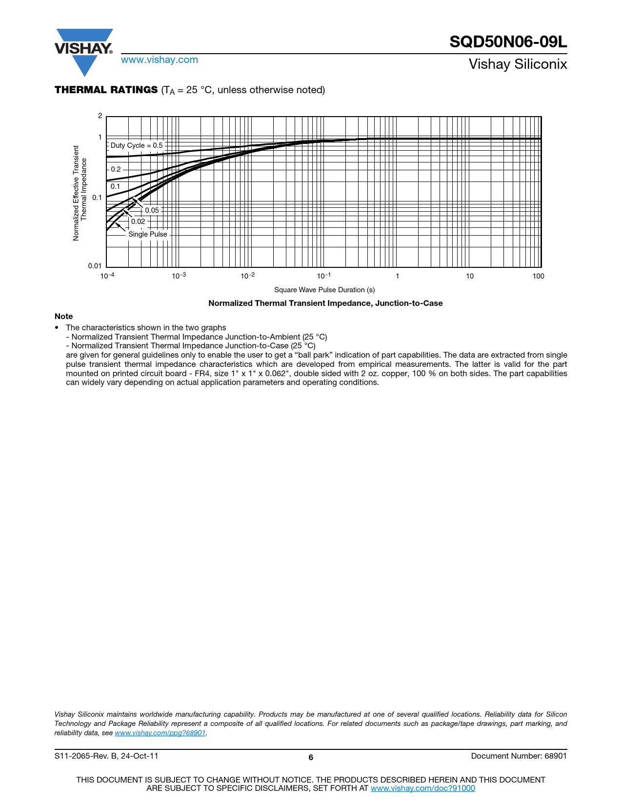 • The characteristics shown in the two graphs - Normalized Transient Thermal Impedance Junction-to-Ambient (25 °C) - Normalized Transient Thermal Impedance Junction-to-Case (25 °C) are given for general guidelines only to enable the user to get a “ball park” indication of part capabilities. The data are extracted from single pulse transient thermal impedance characteristics which are developed from empirical measurements. The latter is valid for the part mounted on printed circuit board - FR4, size 1" x 1" x 0.062", double sided with 2 oz. copper, 100 % on both sides. The part capabilities can widely vary depending on actual application parameters and operating conditions. Vishay Siliconix maintains worldwide manufacturing capability. Products may be manufactured at one of several qualified locations. Reliability data for Silicon Technology and Package Reliability represent a composite of all qualified locations. For related documents such as package/tape drawings, part marking, and reliability data, see www.vishay.com/ppg?68901. S11-2065-Rev. B, 24-Oct-11