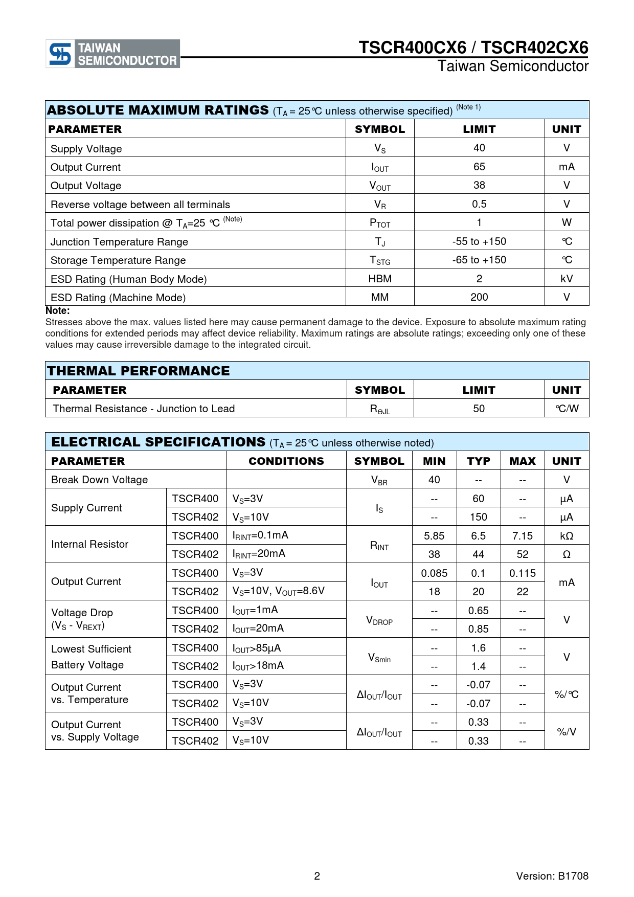 TSCR400CX6 / TSCR402CX6. ABSOLUTE MAXIMUM RATINGS. PARAMETER. SYMBOL. LIMIT. UNIT. Note:. THERMAL PERFORMANCE