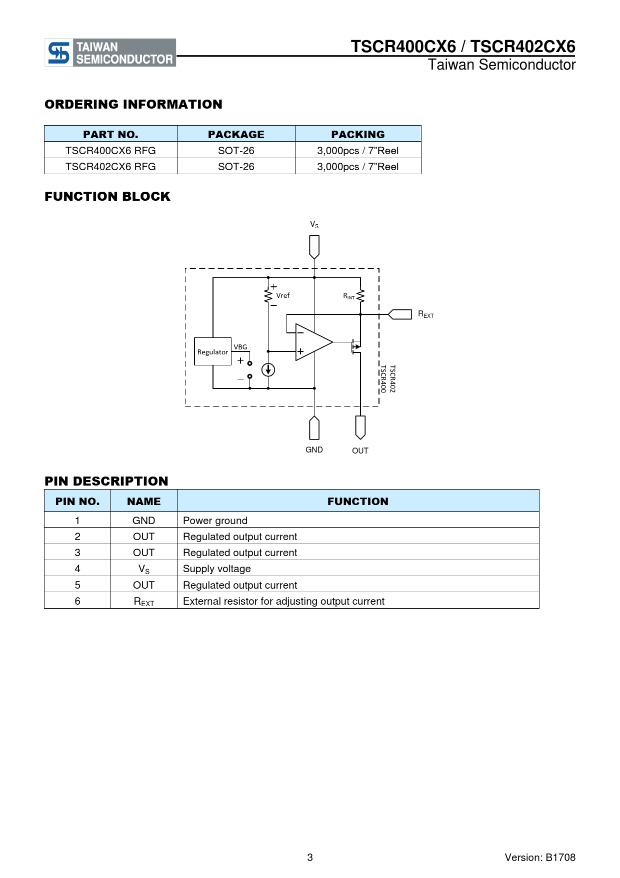 TSCR400CX6 / TSCR402CX6. ORDERING INFORMATION. PART NO. PACKAGE. PACKING. FUNCTION BLOCK. PIN DESCRIPTION. PIN NO. NAME. FUNCTION