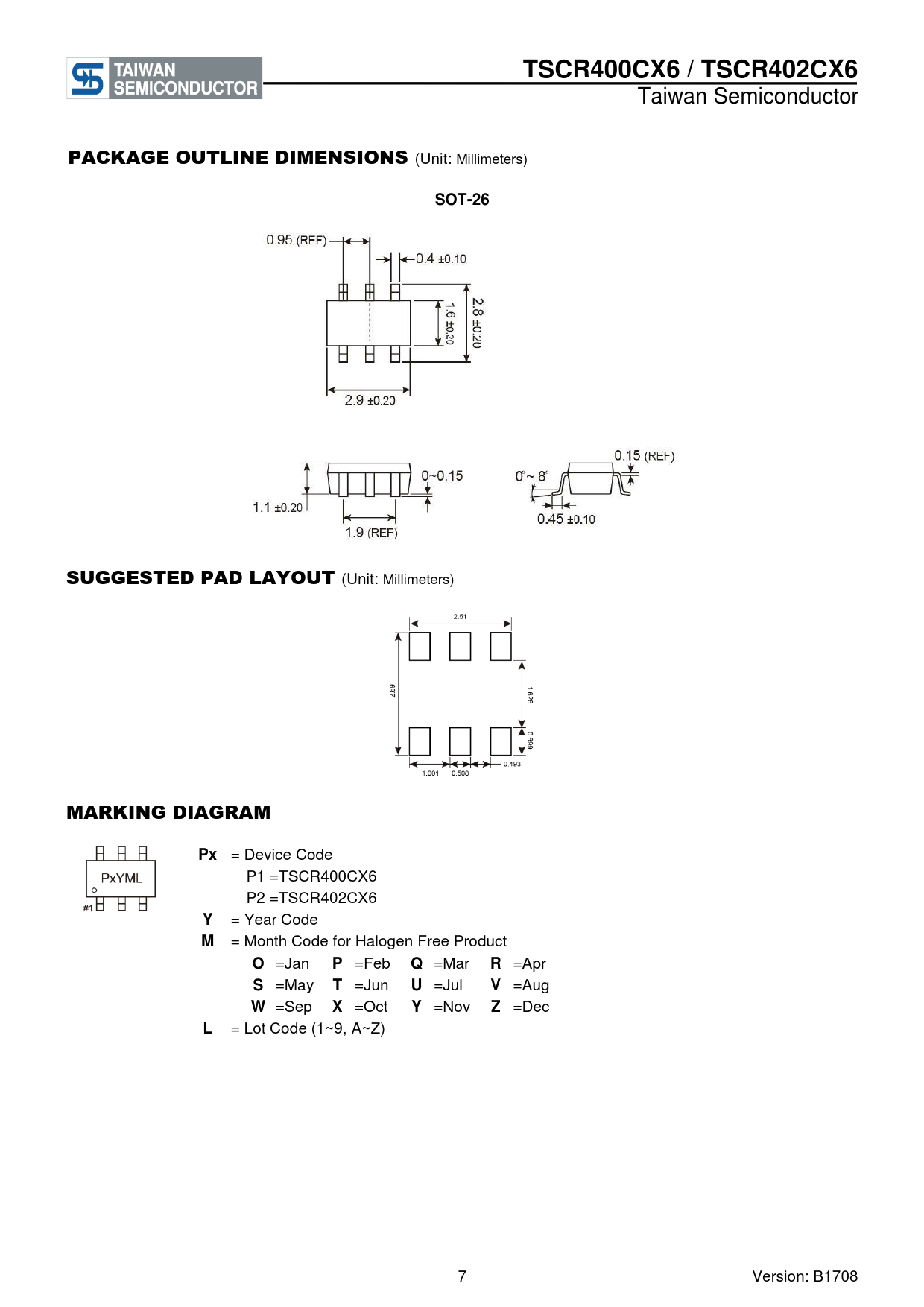 TSCR400CX6 / TSCR402CX6 Taiwan Semiconductor PACKAGE OUTLINE DIMENSIONS (Unit: Millimeters) SOT-26SUGGESTED PAD LAYOUT (Unit: Millimeters) MARKING DIAGRAMPx = Device Code P1 =TSCR400CX6 P2 =TSCR402CX6 Y = Year Code M = Month Code for Halogen Free Product O =Jan P =Feb Q =Mar R =Apr S =May T =Jun U =Jul V =Aug W =Sep X =Oct Y =Nov Z =Dec L = Lot Code (1~9, A~Z) 7 Version: B1708