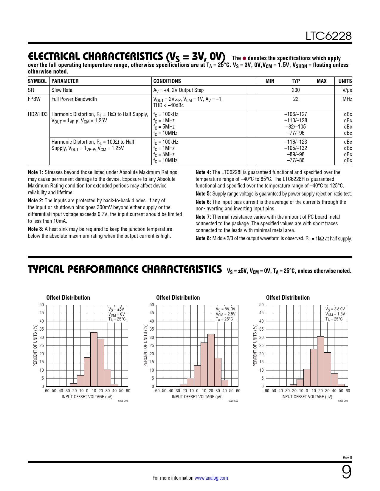 LTC6228 ELECTRICAL CHARACTERISTICS (VThe l denotes the specifications which applyS = 3V, 0V)over the full operating temperature range, otherwise specifications are at TA = 25°C. VS = 3V, 0V,VCM = 1.5V, VSHDN = floating unlessotherwise noted. SYMBOL PARAMETERCONDITIONSMINTYPMAXUNITS SR Slew Rate AV = +4, 2V Output Step 200 V/μs FPBW Full Power Bandwidth VOUT = 2VP-P, VCM = 1V, AV = –1, 22 MHz THD < –40dBc HD2/HD3 Harmonic Distortion, RL = 1kΩ to Half Supply, fC = 100kHz –106/–127 dBc VOUT = 1VP-P, VCM = 1.25V fC = 1MHz –110/–128 dBc fC = 5MHz –82/–105 dBc fC = 10MHz –77/–96 dBc Harmonic Distortion, RL = 100Ω to Half fC = 100kHz –116/–123 dBc Supply, VOUT = 1VP-P, VCM = 1.25V fC = 1MHz –105/–132 dBc fC = 5MHz –89/–98 dBc fC = 10MHz –77/–86 dBc Note 1: Stresses beyond those listed under Absolute Maximum Ratings Note 4: The LTC6228I is guaranteed functional and specified over the may cause permanent damage to the device. Exposure to any Absolute temperature range of –40°C to 85°C. The LTC6228H is guaranteed Maximum Rating condition for extended periods may affect device functional and specified over the temperature range of –40°C to 125°C. reliability and lifetime. Note 5: Supply range voltage is guaranteed by power supply rejection ratio test. Note 2: The inputs are protected by back-to-back diodes. If any of Note 6: The input bias current is the average of the currents through the the input or shutdown pins goes 300mV beyond either supply or the non-inverting and inverting input pins. differential input voltage exceeds 0.7V, the input current should be limited Note 7: Thermal resistance varies with the amount of PC board metal to less than 10mA. connected to the package. The specified values are with short traces Note 3: A heat sink may be required to keep the junction temperature connected to the leads with minimal metal area. below the absolute maximum rating when the output current is high. Note 8: Middle 2/3 of the output waveform is observed. RL = 1kΩ at half supply. TYPICAL PERFORMANCE CHARACTERISTICSVS = ±5V, VCM = 0V, TA = 25°C, unless otherwise noted.Offset DistributionOffset DistributionOffset Distribution 50 50 50 VS = ±5V VS = 5V, 0V VS = 3V, 0V 45 V 45 45 CM = 0V VCM = 2.5V VCM = 1.5V TA = 25°C 40 40 TA = 25°C 40 TA = 25°C 35 35 35 30 30 30 25 25 25 20 20 20 15 15 15 PERCENT OF UNITS (%) PERCENT OF UNITS (%) PERCENT OF UNITS (%) 10 10 10 5 5 5 0 0 0 –60–50–40–30–20–10 0 10 20 30 40 50 60 –60–50–40–30–20–10 0 10 20 30 40 50 60 –60–50–40–30–20–10 0 10 20 30 40 50 60 INPUT OFFSET VOLTAGE (µV) INPUT OFFSET VOLTAGE (µV) INPUT OFFSET VOLTAGE (µV) 6228 G01 6228 G02 6228 G03 Rev 0 For more information www.analog.com 9 Document Outline Features Applications Typical Application Description Absolute Maximum Ratings Pin Configuration Order Information Electrical Characteristics (VS = ±5V) Electrical Characteristics (VS = 5V, 0V) Electrical Characteristics (VS = 3V, 0V) Typical Performance Characteristics Pin Functions Applications Information Typical Applications Package Description Typical Application Related Parts