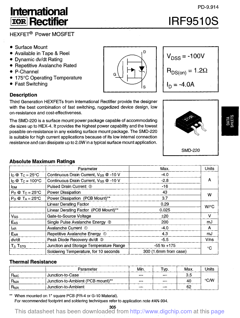 | Beschreibung | -100V Single P-channel HexFET Power MOSFET in a D2-Pak Package |