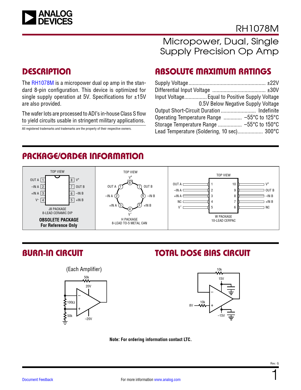 Rev. G Document Feedback For more information www.analog.com 1 Document Outline Description Package/Order Information Burn-In Circuit Total Dose Bias Circuit Absolute Maximum Ratings Table 1: Electrical Characteristics Table 1A: Electrical Characteristics Table 2: Electrical Test Requirements Typical Applications Revision History