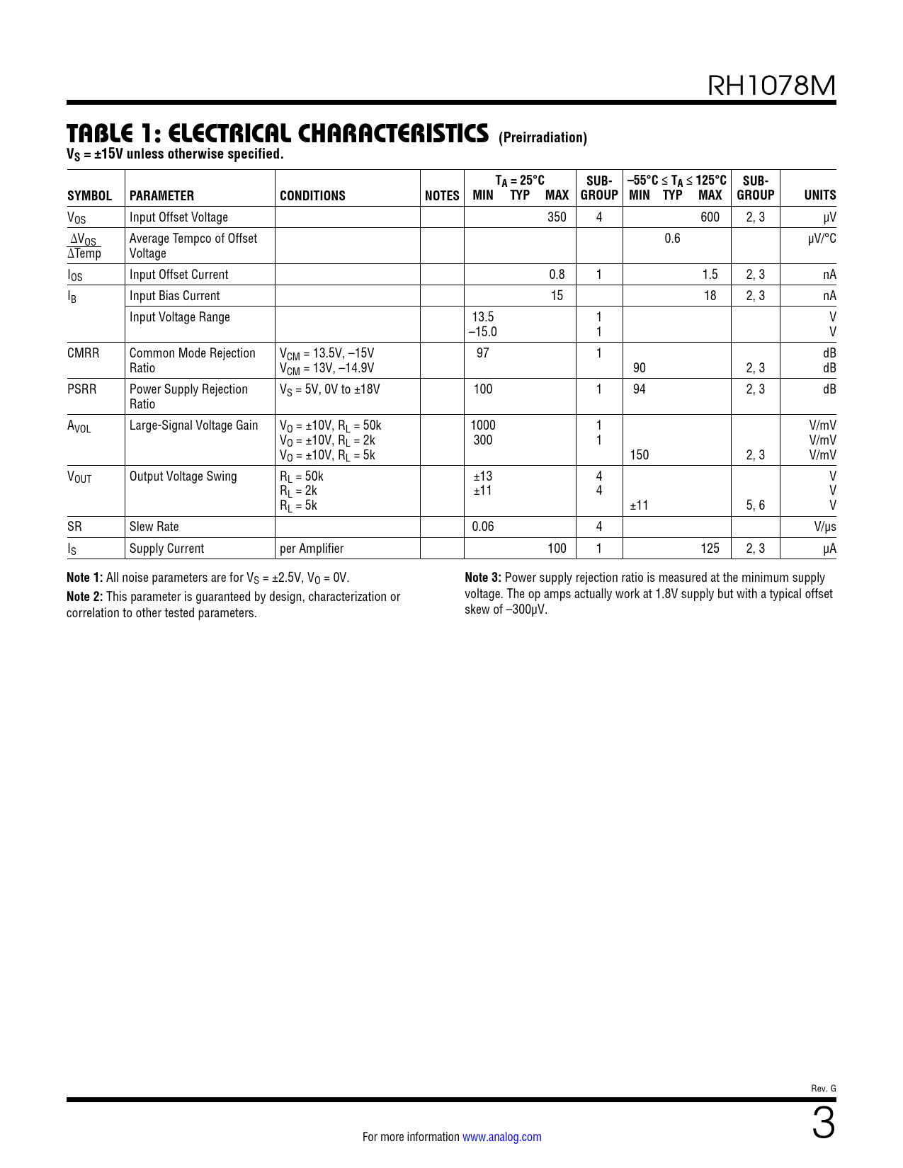 TABLE 1: ELECTRICAL CHARACTERISTICS (Preirradiation) VS = ±15V unless otherwise specified. TA = 25°C SUB- –55°C ≤ TA ≤ 125°C SUB- SYMBOL PARAMETER CONDITIONS NOTES MIN TYP MAX GROUP MIN TYP MAX GROUP UNITS