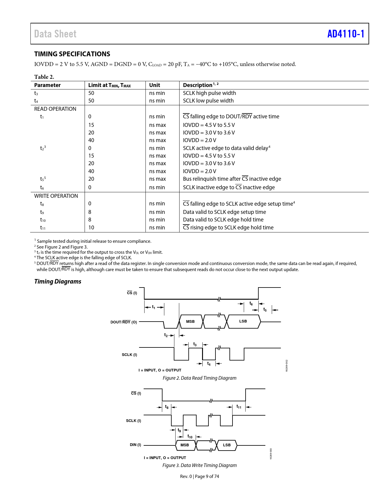 link to page 9 link to page 9 Data SheetAD4110-1TIMING SPECIFICATIONS IOVDD = 2 V to 5.5 V, AGND = DGND = 0 V, CLOAD = 20 pF, TA = −40°C to +105°C, unless otherwise noted. Table 2. ParameterLimit at TMIN, TMAXUnitDescription1, 2 t3 50 ns min SCLK high pulse width t4 50 ns min SCLK low pulse width READ OPERATION t1 0 ns min CS falling edge to DOUT/RDY active time 15 ns max IOVDD = 4.5 V to 5.5 V 20 ns max IOVDD = 3.0 V to 3.6 V 40 ns max IOVDD = 2.0 V t 3 2 0 ns min SCLK active edge to data valid delay4 15 ns max IOVDD = 4.5 V to 5.5 V 20 ns max IOVDD = 3.0 V to 3.6 V 40 ns max IOVDD = 2.0 V t 5 5 20 ns max Bus relinquish time after CS inactive edge t6 0 ns min SCLK inactive edge to CS inactive edge WRITE OPERATION t8 0 ns min CS falling edge to SCLK active edge setup time4 t9 8 ns min Data valid to SCLK edge setup time t10 8 ns min Data valid to SCLK edge hold time t11 10 ns min CS rising edge to SCLK edge hold time 1 Sample tested during initial release to ensure compliance. 2 See Figure 2 and Figure 3. 3 t2 is the time required for the output to cross the VOL or VOH limit. 4 The SCLK active edge is the falling edge of SCLK. 5 DOUT/RDY returns high after a read of the data register. In single conversion mode and continuous conversion mode, the same data can be read again, if required, while DOUT/RDY is high, although care must be taken to ensure that subsequent reads do not occur close to the next output update. Timing DiagramsCS (I)t6t1t5DOUT/RDY (O)MSBLSBt2t3SCLK (I)t4 002 I = INPUT, O = OUTPUT 16269- Figure 2. Data Read Timing Diagram CS (I)tt811SCLK (I)t9t10DIN (I)MSBLSB 003 I = INPUT, O = OUTPUT 16269- Figure 3. Data Write Timing Diagram Rev. 0 | Page 9 of 74 Document Outline FEATURES APPLICATIONS GENERAL DESCRIPTION FUNCTIONAL BLOCK DIAGRAM TABLE OF CONTENTS REVISION HISTORY SPECIFICATIONS TIMING SPECIFICATIONS Timing Diagrams ABSOLUTE MAXIMUM RATINGS THERMAL RESISTANCE ESD CAUTION PIN CONFIGURATION AND FUNCTION DESCRIPTIONS TYPICAL PERFORMANCE CHARACTERISTICS THEORY OF OPERATION POWER SUPPLY SEQUENCE PROTECTION DIODE ANALOG INPUT PULL-UP/PULL-DOWN CURRENTS ANTIALIASING FILTER RTD EXCITATION CURRENTS FIELD POWER SUPPLY MODE NO POWER SUPPLY MODE BIAS VOLTAGE GENERATOR PGA CALIBRATION REGISTERS SERIAL INTERFACE CLOCK ADC ADC FILTER REGISTERS ADC GAIN AND OFFSET REGISTERS NOISE PERFORMANCE AND RESOLUTION MODES OF OPERATION DEFAULT MODE OF OPERATION ON POWER-UP CHANGING THE DEFAULT MODE OF OPERATION FOR FUTURE POWER-UP CYCLES POWER SUPPLY REQUIREMENTS SYSTEM CLOCK REQUIREMENTS BIPOLAR AND UNIPOLAR OUTPUT AUXILIARY LOW VOLTAGE INPUTS DIGITAL FILTER CONTINUOUS CONVERSION MODE INPUT AUTO SEQUENCING SINGLE CONVERSION MODE ADC CONVERSION DELAY BIAS VOLTAGE GENERATOR ANTIALIASING FILTER CIRCUIT CURRENT MODE Transimpedance Gain Using an External Sense Resistor VOLTAGE AND THERMOCOUPLE MODE Input Scaling for Voltage Mode Thermocouple Inputs RTD MODE Generating RTD Currents with an External Resistor Excitation Currents RTD Initial Drift 4-Wire RTD 3-Wire RTD 2-Wire RTD Alternative 3-Wire Configuration FIELD POWER SUPPLY MODE Overvoltage Protection NO POWER SUPPLY MODE Voltage Mode Current Mode System Redundancy GAIN CALIBRATION DATA REGISTER GAIN CALIBRATION IN VOLTAGE MODE GAIN CALIBRATION IN CURRENT MODE SCALING FACTOR AUTOCALIBRATION MODES APPLICATION EXAMPLES Example 1 Example 2 DIAGNOSTICS AND PROTECTION DIAGNOSTIC FLAGS ERROR PIN OVERTEMPERATURE DETECTION AND THERMAL SHUTDOWN OVERVOLTAGE AND UNDERVOLTAGE DETECTION OVERVOLTAGE PROTECTION DIAGNOSING OVERVOLTAGE AND UNDERVOLTAGE CONDITIONS OPEN WIRE DETECTION DIAGNOSTICS FOR RTD MEASUREMENTS AND RTD FLAGS NOISE, SETTLING TIME, AND DIGITAL FILTERING DIGITAL FILTER SINC5 + SINC1 FILTER SINC3 FILTER ENHANCED 50 HZ AND 60 HZ REJECTION FILTERS RTD MODE NOISE PERFORMANCE SERIAL PERIPHERAL INTERFACE RESETTING THE AD4110-1 SPI COMMAND TO COMMUNICATIONS REGISTER DOUT/ PIN WRITE OPERATION READ OPERATION MULTIPLE DEVICES ON THE SPI BUS CRC CHECKSUM CRC CHECKSUM METHODS Polynomial Calculation Polynomial CRC Calculation of a 24-Bit Word: 0x654321 (Eight Command Bits and 16-Bit Data) XOR Calculation REGISTER DETAILS AFE REGISTER MAP AFE REGISTER DESCRIPTIONS AFE_TOP_STATUS Register AFE_CNTRL1 Register AFE_CLK_CTRL Register AFE_CNTRL2 Register PGA_RTD_CTRL Register AFE_ERR_DISABLE Register AFE_DETAIL_STATUS Register AFE_CAL_DATA Register AFE_RSENSE_DATA Register NO_PWR_DEFAULT_SEL Register NO_PWR_DEFAULT_STATUS Register ADC REGISTER MAP ADC REGISTER DESCRIPTIONS ADC_STATUS Register ADC_MODE Register ADC_INTERFACE Register ADC_CONFIG Register Data Register Filter Register ADC_GPIO_CONFIG Register ID Register ADC_OFFSET0 Register ADC_OFFSET1 Register ADC_OFFSET2 Register ADC_OFFSET3 Register ADC_GAIN0 Register ADC_GAIN1 Register ADC_GAIN2 Register ADC_GAIN3 Register OUTLINE DIMENSIONS ORDERING GUIDE
