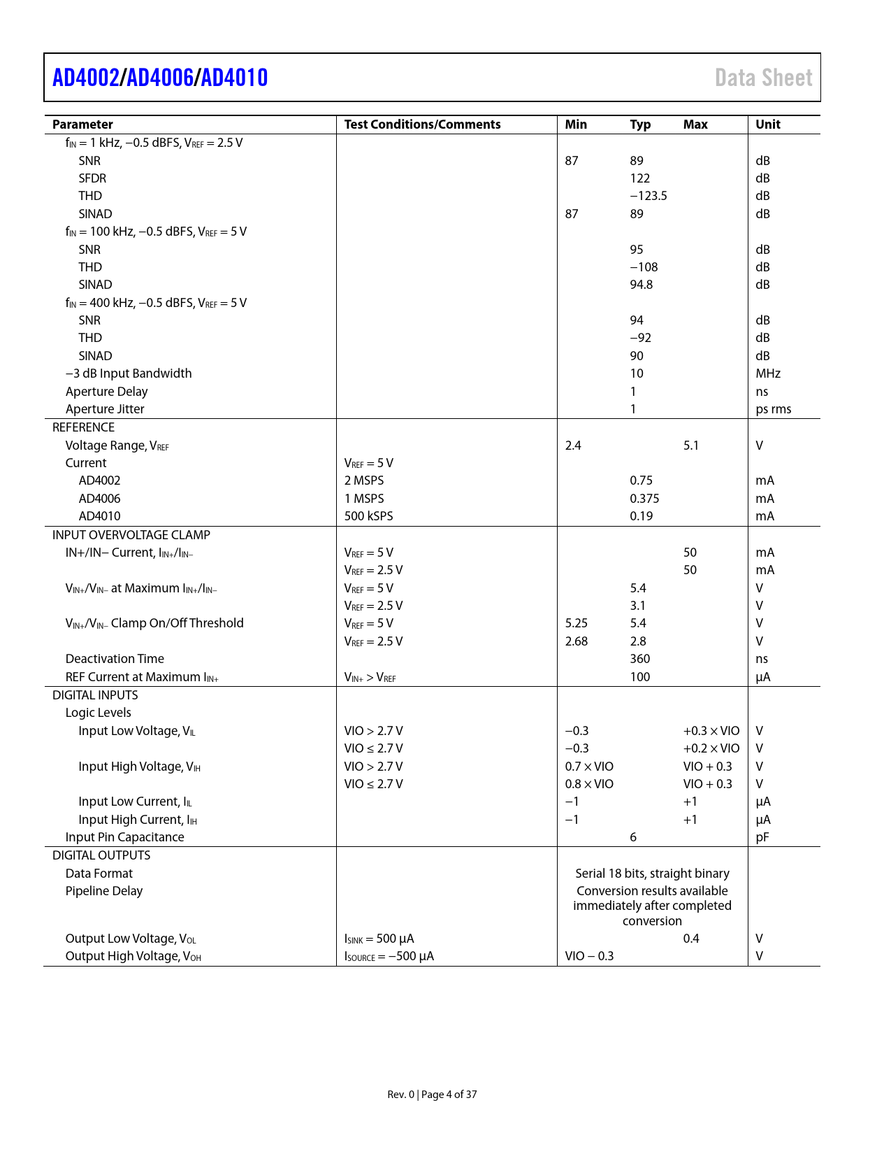 AD4002/AD4006/AD4010Data SheetParameterTest Conditions/CommentsMinTypMaxUnit fIN = 1 kHz, −0.5 dBFS, VREF = 2.5 V SNR 87 89 dB SFDR 122 dB THD −123.5 dB SINAD 87 89 dB fIN = 100 kHz, −0.5 dBFS, VREF = 5 V SNR 95 dB THD −108 dB SINAD 94.8 dB fIN = 400 kHz, −0.5 dBFS, VREF = 5 V SNR 94 dB THD −92 dB SINAD 90 dB −3 dB Input Bandwidth 10 MHz Aperture Delay 1 ns Aperture Jitter 1 ps rms REFERENCE Voltage Range, VREF 2.4 5.1 V Current VREF = 5 V AD4002 2 MSPS 0.75 mA AD4006 1 MSPS 0.375 mA AD4010 500 kSPS 0.19 mA INPUT OVERVOLTAGE CLAMP IN+/IN− Current, IIN+/IIN− VREF = 5 V 50 mA VREF = 2.5 V 50 mA VIN+/VIN− at Maximum IIN+/IIN− VREF = 5 V 5.4 V VREF = 2.5 V 3.1 V VIN+/VIN− Clamp On/Off Threshold VREF = 5 V 5.25 5.4 V VREF = 2.5 V 2.68 2.8 V Deactivation Time 360 ns REF Current at Maximum IIN+ VIN+ > VREF 100 µA DIGITAL INPUTS Logic Levels Input Low Voltage, VIL VIO > 2.7 V −0.3 +0.3 × VIO V VIO ≤ 2.7 V −0.3 +0.2 × VIO V Input High Voltage, VIH VIO > 2.7 V 0.7 × VIO VIO + 0.3 V VIO ≤ 2.7 V 0.8 × VIO VIO + 0.3 V Input Low Current, IIL −1 +1 µA Input High Current, IIH −1 +1 µA Input Pin Capacitance 6 pF DIGITAL OUTPUTS Data Format Serial 18 bits, straight binary Pipeline Delay Conversion results available immediately after completed conversion Output Low Voltage, VOL ISINK = 500 µA 0.4 V Output High Voltage, VOH ISOURCE = −500 µA VIO − 0.3 V Rev. 0 | Page 4 of 37 Document Outline FEATURES APPLICATIONS GENERAL DESCRIPTION FUNCTIONAL BLOCK DIAGRAM TABLE OF CONTENTS REVISION HISTORY SPECIFICATIONS TIMING SPECIFICATIONS ABSOLUTE MAXIMUM RATINGS THERMAL RESISTANCE ESD CAUTION PIN CONFIGURATIONS AND FUNCTION DESCRIPTIONS TYPICAL PERFORMANCE CHARACTERISTICS TERMINOLOGY THEORY OF OPERATION CIRCUIT INFORMATION CONVERTER OPERATION TRANSFER FUNCTIONS APPLICATIONS INFORMATION TYPICAL APPLICATION DIAGRAMS ANALOG INPUTS Input Overvoltage Clamp Circuit Switched Capacitor Input RC Filter Values DRIVER AMPLIFIER CHOICE High Frequency Input Signals Multiplexed Applications EASE OF DRIVE FEATURES Input Span Compression High-Z Mode Long Acquisition Phase VOLTAGE REFERENCE INPUT POWER SUPPLY DIGITAL INTERFACE REGISTER READ/WRITE FUNCTIONALITY STATUS WORD CSB MODE, 3-WIRE TURBO MODE CSB MODE, 3-WIRE WITHOUT BUSY INDICATOR CSB MODE, 3-WIRE WITH BUSY INDICATOR CSB MODE, 4-WIRE TURBO MODE CSB MODE, 4-WIRE WITHOUT BUSY INDICATOR CSB MODE, 4-WIRE WITH BUSY INDICATOR DAISY-CHAIN MODE LAYOUT GUIDELINES EVALUATING THE AD4002/AD4006/AD4010 PERFORMANCE OUTLINE DIMENSIONS ORDERING GUIDE