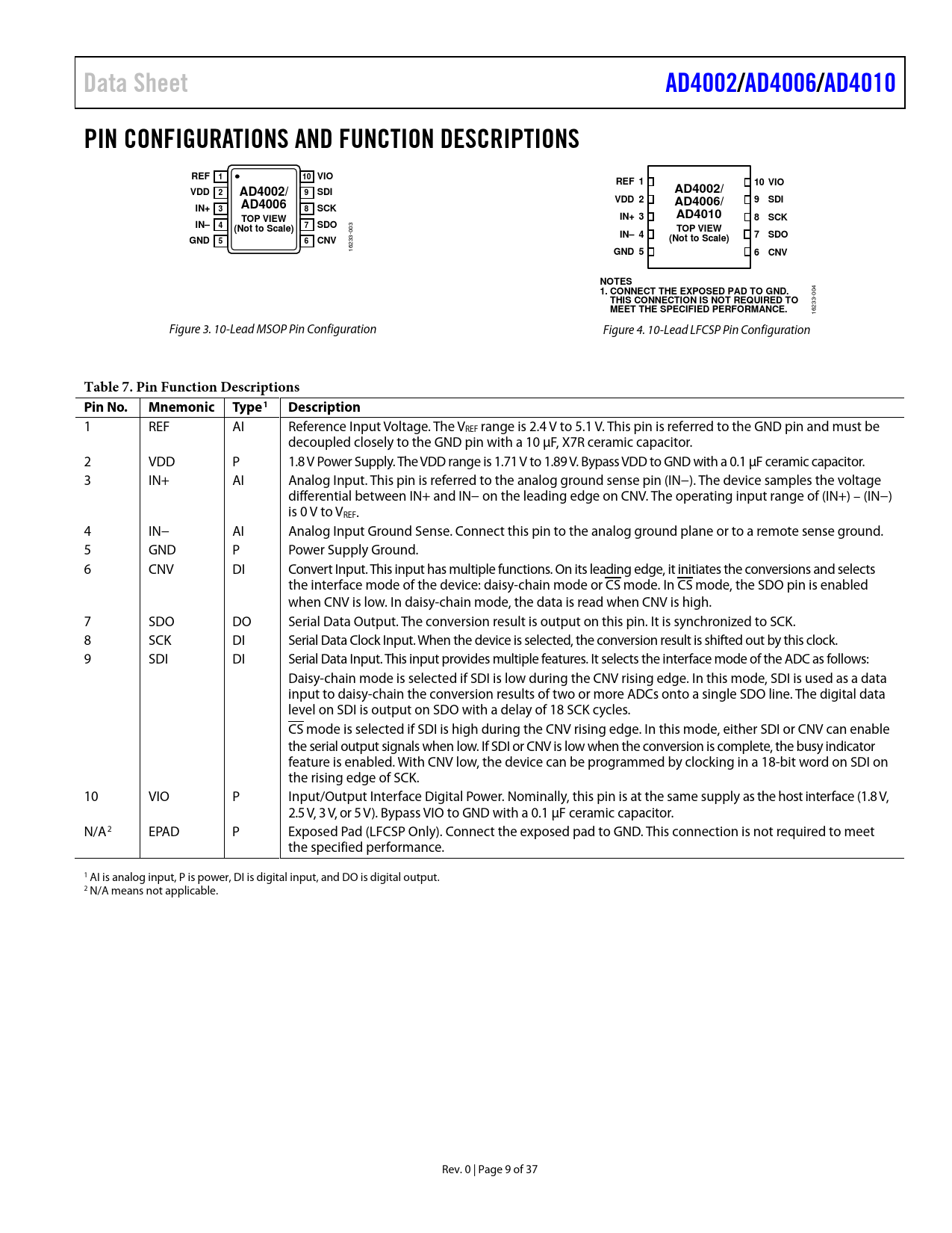 Data Sheet AD4002/ AD4006/ AD4010 PIN CONFIGURATIONS AND FUNCTION DESCRIPTIONS REF 10 VIO REF 1 VDD SDI VDD 2 IN+ AD4006 SCK TOP VIEW