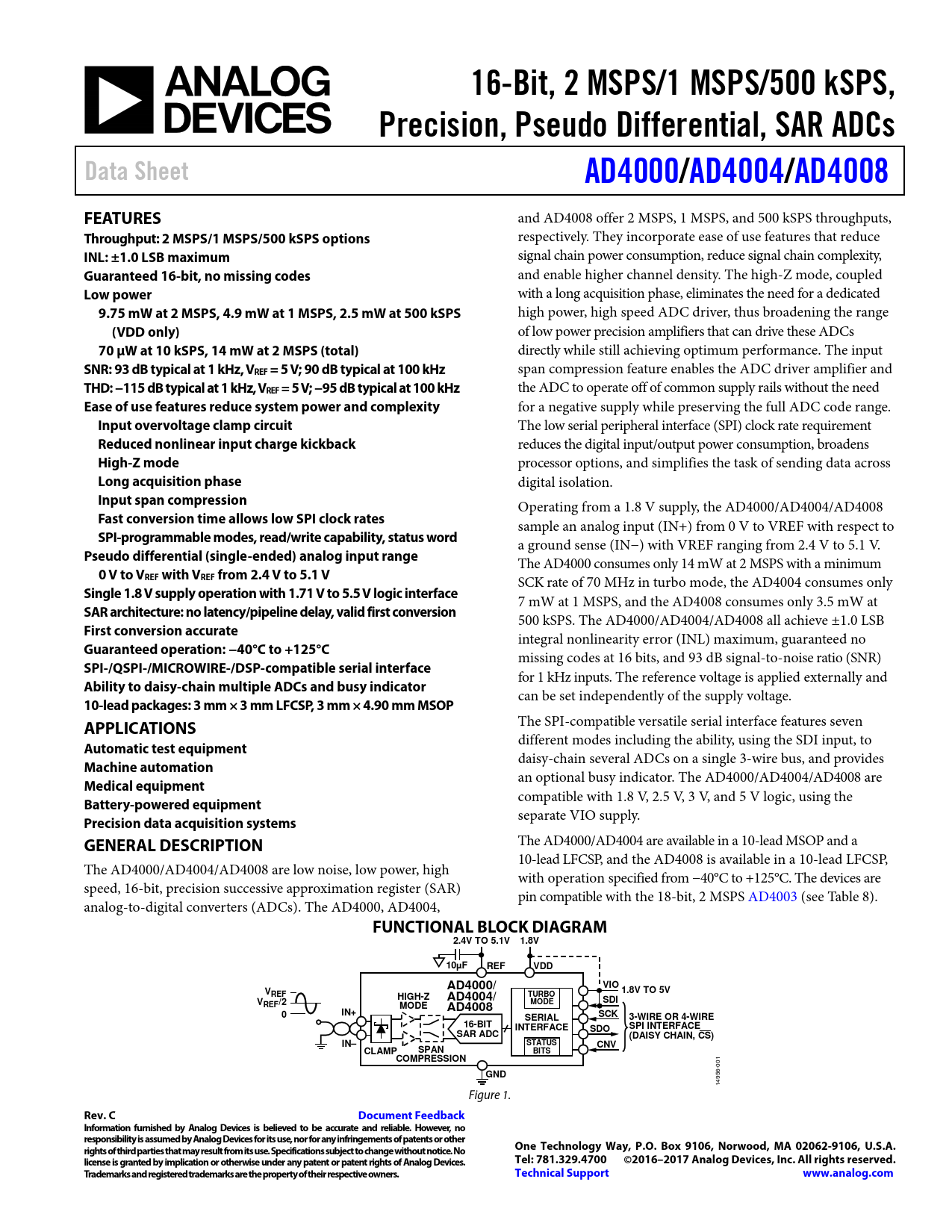 FUNCTIONAL BLOCK DIAGRAM 2.4V TO 5.1V 1.8V 10µF REF VDD AD4000/ VIO V 1.8V TO 5V REF HIGH-Z AD4004/ TURBO SDI VREF/2 MODE AD4008 MODE 0 IN+ SCK SERIAL 3-WIRE OR 4-WIRE 16-BIT INTERFACE SDO SPI INTERFACE SAR ADC (DAISY CHAIN, CS) IN– STATUS CNV CLAMP SPAN BITS COMPRESSION