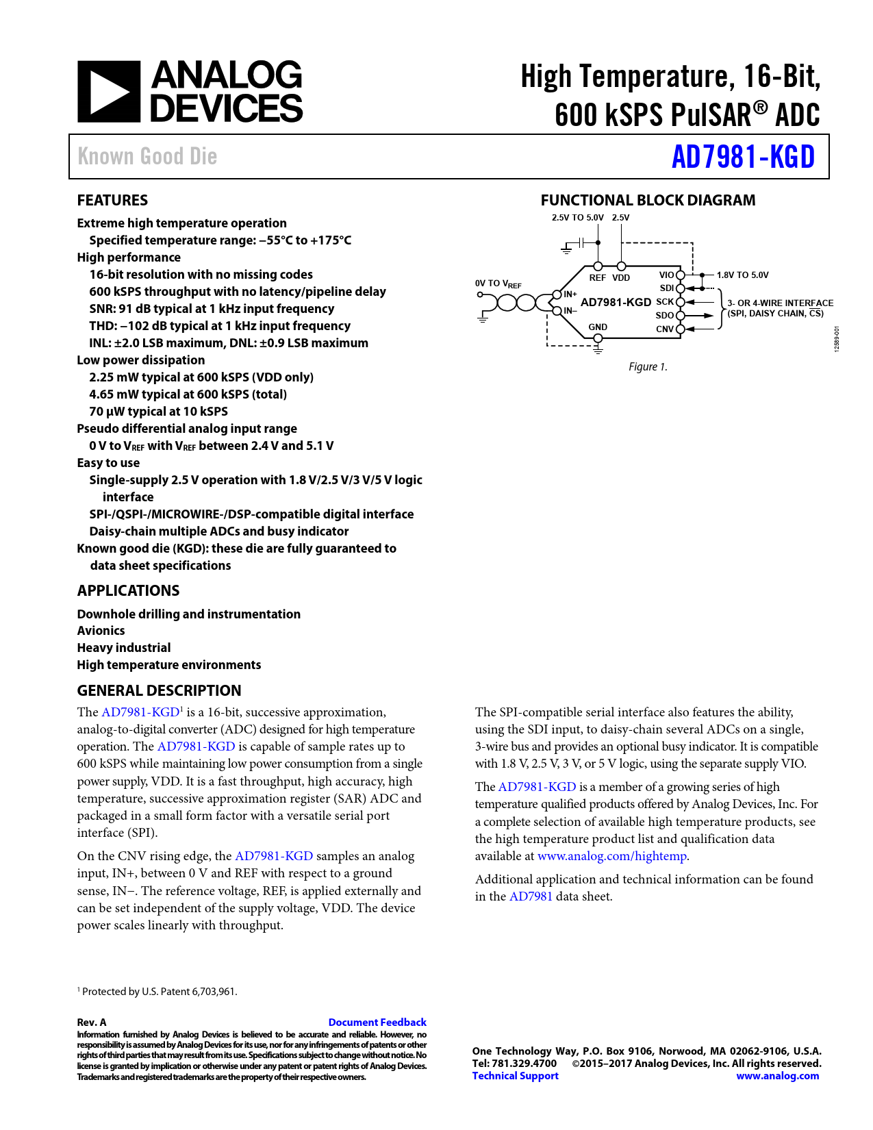 High Temperature, 16-Bit,. 600 kSPS PulSAR® ADC. Known Good Die. AD7981-KGD. FEATURES. FUNCTIONAL BLOCK DIAGRAM