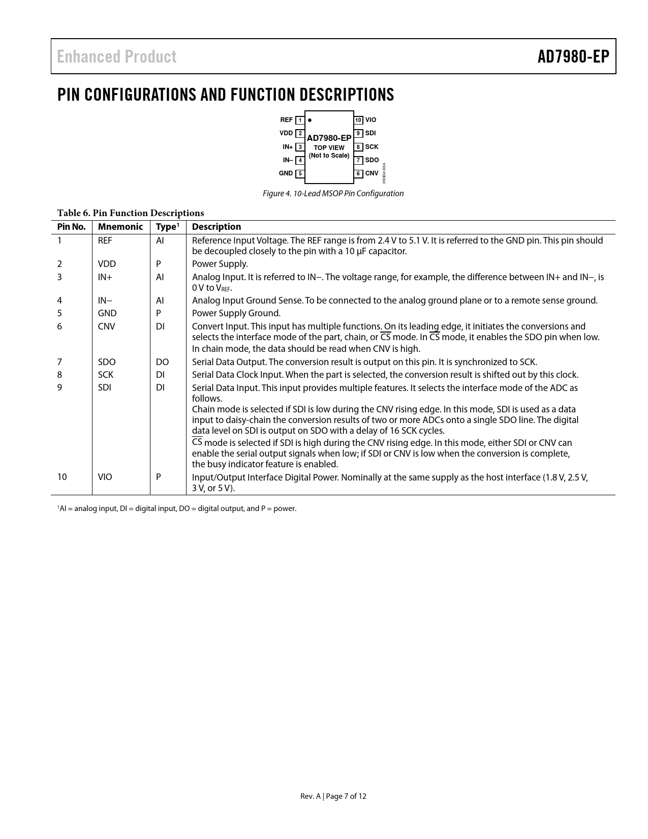 Enhanced Product. AD7980-EP. PIN CONFIGURATIONS AND FUNCTION DESCRIPTIONS. REF. 10 VIO. VDD. SDI. IN+. TOP VIEW. SCK. (Not to Scale). IN–. SDO