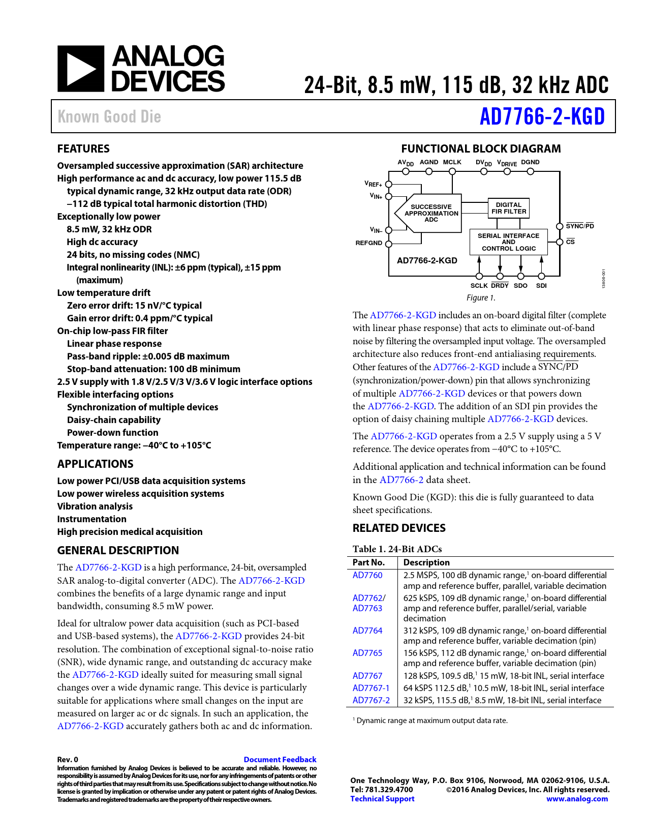 24-Bit, 8.5 mW, 115 dB, 32 kHz ADC. Known Good Die. AD7766-2-KGD. FEATURES. FUNCTIONAL BLOCK DIAGRAM