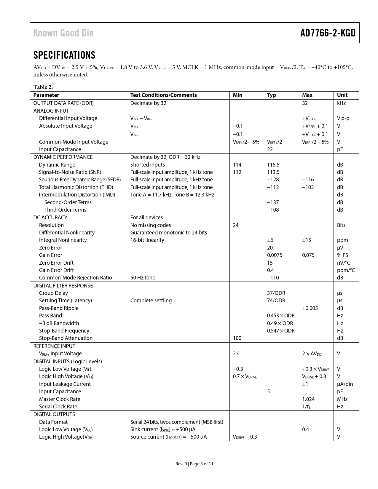 Known Good Die AD7766-2-KGD SPECIFICATIONS Table 2 Parameter Test Conditions/Comments Min Typ Max Unit