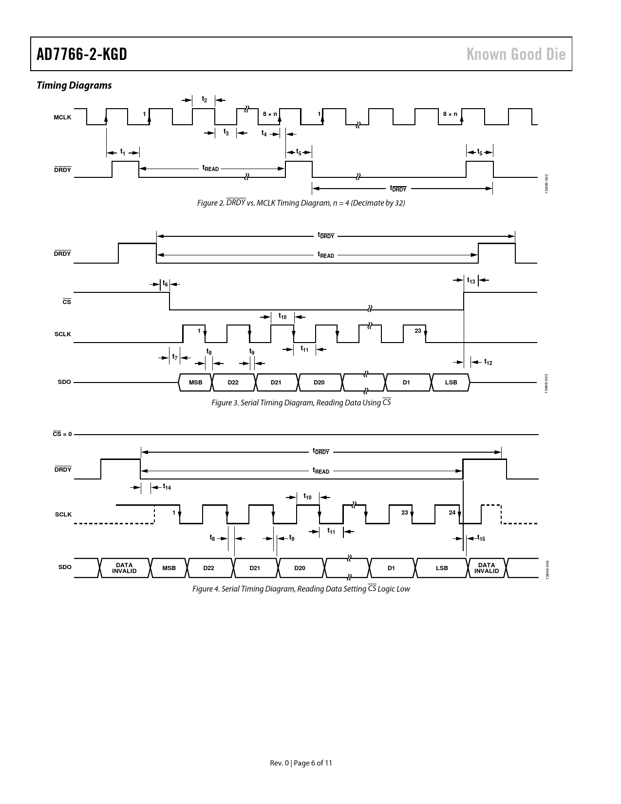 AD7766-2-KGD. Known Good Die. Timing Diagrams. 8 × n. MCLK. DRDY. tREAD. tDRDY. t13. t10. SCLK. t11. t12. SDO. MSB. D22. D21. D20. LSB. CS = 0. t14. t15. DATA