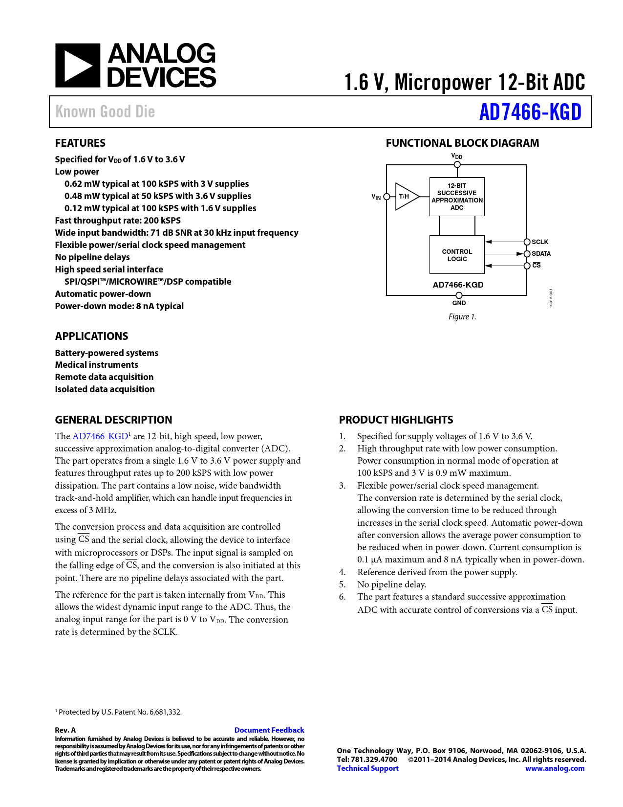 1.6 V, Micropower 12-Bit ADC. Known Good Die. AD7466-KGD. FEATURES. FUNCTIONAL BLOCK DIAGRAM. Specified for V. VDD