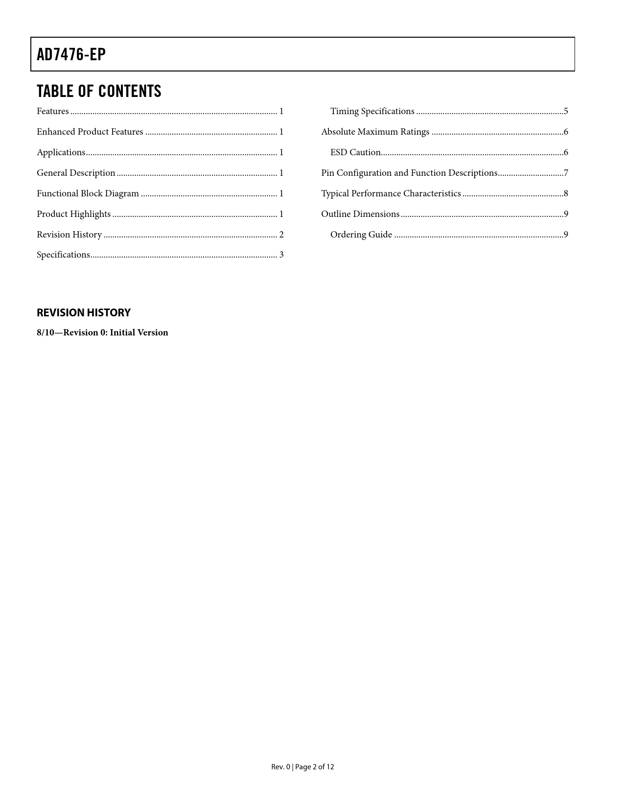 Seiten / Seite12 / 2 — AD7476-EP. TABLE OF CONTENTS. REVISION HISTORY. 8/10—Revision 0: Initial …