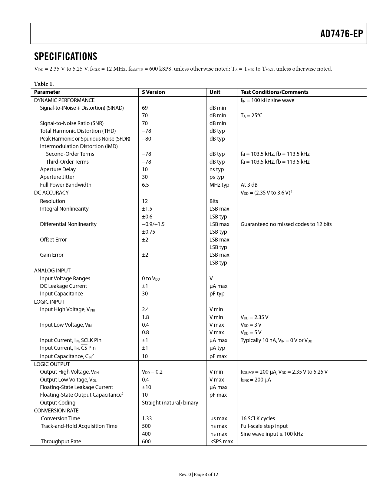 AD7476-EP. SPECIFICATIONS. Table 1. Parameter. S Version. Unit. Test Conditions/Comments