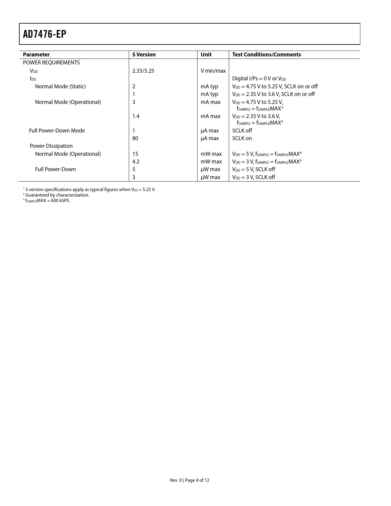 AD7476-EP Parameter S Version Unit Test Conditions/Comments
