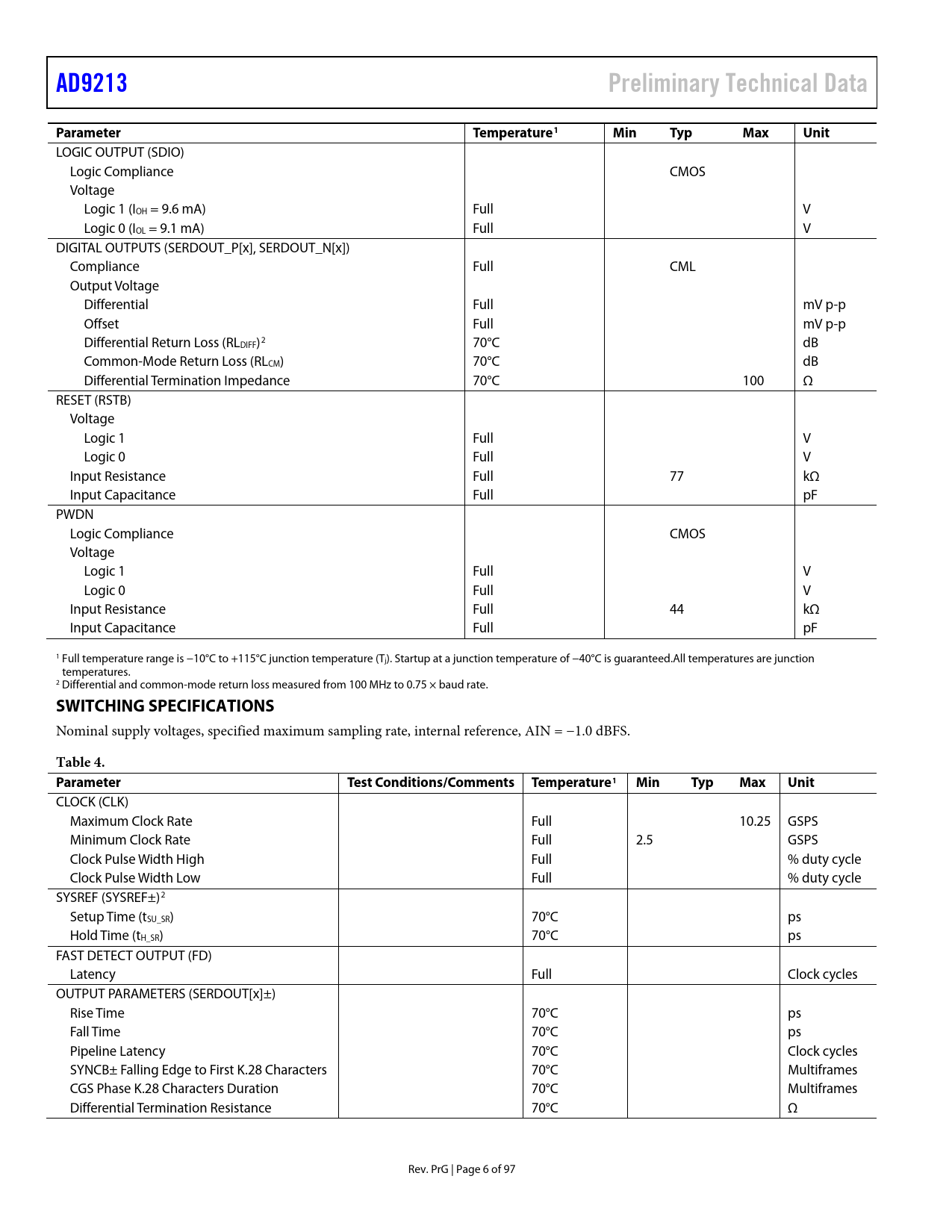 link to page 7 link to page 7 AD9213Preliminary Technical DataParameterTemperature1MinTypMaxUnit LOGIC OUTPUT (SDIO) Logic Compliance CMOS Voltage Logic 1 (IOH = 9.6 mA) Full V Logic 0 (IOL = 9.1 mA) Full V DIGITAL OUTPUTS (SERDOUT_P[x], SERDOUT_N[x]) Compliance Full CML Output Voltage Differential Full mV p-p Offset Full mV p-p Differential Return Loss (RLDIFF)2 70°C dB Common-Mode Return Loss (RLCM) 70°C dB Differential Termination Impedance 70°C 100 Ω RESET (RSTB) Voltage Logic 1 Full V Logic 0 Full V Input Resistance Full 77 kΩ Input Capacitance Full pF PWDN Logic Compliance CMOS Voltage Logic 1 Full V Logic 0 Full V Input Resistance Full 44 kΩ Input Capacitance Full pF 1 Full temperature range is −10°C to +115°C junction temperature (Tj). Startup at a junction temperature of −40°C is guaranteed.All temperatures are junction temperatures. 2 Differential and common-mode return loss measured from 100 MHz to 0.75 × baud rate. SWITCHING SPECIFICATIONS Nominal supply voltages, specified maximum sampling rate, internal reference, AIN = −1.0 dBFS. Table 4. ParameterTest Conditions/Comments Temperature1MinTypMaxUnit CLOCK (CLK) Maximum Clock Rate Full 10.25 GSPS Minimum Clock Rate Full 2.5 GSPS Clock Pulse Width High Full % duty cycle Clock Pulse Width Low Full % duty cycle SYSREF (SYSREF±)2 Setup Time (tSU_SR) 70°C ps Hold Time (tH_SR) 70°C ps FAST DETECT OUTPUT (FD) Latency Full Clock cycles OUTPUT PARAMETERS (SERDOUT[x]±) Rise Time 70°C ps Fall Time 70°C ps Pipeline Latency 70°C Clock cycles SYNCB± Falling Edge to First K.28 Characters 70°C Multiframes CGS Phase K.28 Characters Duration 70°C Multiframes Differential Termination Resistance 70°C Ω Rev. PrG | Page 6 of 97 Document Outline FEATURES GENERAL DESCRIPTION FUNCTIONAL BLOCK DIAGRAM TABLE OF CONTENTS SPECIFICATIONS DC SPECIFICATIONS AC SPECIFICATIONS DIGITAL SPECIFICATIONS SWITCHING SPECIFICATIONS TIMING SPECIFICATIONS Timing Diagrams ABSOLUTE MAXIMUM RATINGS THERMAL CHARACTERISTICS ESD CAUTION PIN CONFIGURATION AND FUNCTION DESCRIPTIONS TYPICAL PERFORMANCE CHARACTERISTICS AD9213-6G AD9213-10G EQUIVALENT CIRCUITS THEORY OF OPERATION ADC ARCHITECTURE ANALOG INPUT CONSIDERATIONS Differential Input Configurations Input Common Mode Input Overvoltage Clamp VOLTAGE REFERENCE CLOCK INPUT CONSIDERATIONS Clock Synthesis Clock Jitter Considerations Power-Down/Standby Mode Temperature Diode and Sensor TMU ADC FAST DETECT FAST THRESHOLD DETECTION (FD) DIGITAL DOWNCONVERTER DDC GENERAL DESCRIPTION Frequency Translation Stage (Optional) Filtering Stage Gain Stage (Optional) Complex to Real Conversion Stage (Optional) DDC FREQUENCY TRANSLATION Variable IF Mode ZIF Mode fS/4 Hz IF Mode Test Mode DDC NCO Description DDC NCO Programmable Modulus Mode DDC NCO Coherent Mode NCO FTW/POW/MAW/MAB Description NCO FTW/POW/MAW/MAB Programmable Modulus Mode Example Calculation NCO FTW/POW/MAW/MAB Coherent Mode Example Calculation NCO Channel Selection GPIO Level Control Mode GPIO Edge Control Mode Profile Select Timer Mode Register Map Mode Setting Up the Multichannel NCO Feature NCO Synchronization NCO Multichip Synchronization NCO Multichip Synchronization at Startup NCO Multichip Synchronization during Normal Operation DDC Mixer Description DDC NCO + Mixer Loss and SFDR DDC DECIMATION FILTERS M2_HB7 Filter Description M2_HB6 Filter Description M2_HB5 Filter Description M2_HB4 Filter Description M2_HB3 Filter Description M2_HB2 Filter Description M2_HB1 Filter Description M1_TB2 Filter Description DDC GAIN STAGE DDC COMPLEX TO REAL CONVERSION DDC EXAMPLE CONFIGURATIONS DIGITAL OUTPUTS INTRODUCTION TO THE JESD204B INTERFACE JESD204B OVERVIEW FUNCTIONAL OVERVIEW Transport Layer Data Link Layer Physical Layer JESD204B LINK ESTABLISHMENT Code Group Synchronization (CGS) and SYNCINB± Initial Lane Alignment Sequence (ILAS) User Data and Error Detection 8-Bit/10-Bit Encoder PHYSICAL LAYER (DRIVER) OUTPUTS Digital Outputs, Timing, and Controls De-Emphasis Phase-Locked Loop SETTING UP THE AD9213 DIGITAL INTERFACE JESD204B Transport Layer Settings Serial Line Rates K Settings DETERMINISTIC LATENCY SUBCLASS 0 OPERATION SUBCLASS 1 OPERATION Deterministic Latency Requirements Setting Deterministic Latency Registers MULTICHIP SYNCHRONIZATION SAMPLED SYSREF MODE AVERAGED SYSREF MODE TEST MODES JESD204B TEST MODES SERIAL PORT INTERFACE MEMORY MAP READING THE MEMORY MAP REGISTER TABLES Open and Reserved Locations Default Values Logic Levels SPI Soft Reset REGISTER DETAILS: SYSTEM CONTROL SIGNALS (SPI_ONLY_REGMAP) REGISTER DETAILS: (USER_CTRL) REGISTER DETAILS: (AD9213_CUST_SPI_REGMAP) REGISTER DETAILS: (MAIN_REGMAP) REGISTER DETAILS: JTX_QBF REGISTER REGISTER DETAILS: DIG_DP_REGMAP REGISTER DETAILS: (AD9213_CUST_REG) REGISTER DETAILS: LCPLL_28NM REGISTER REGISTER DETAILS: JESD204B REGISTER MAP FOR FOUR CHANNELS (JTX_28NM_16CH) APPLICATIONS INFORMATION POWER SUPPLY RECOMMENDATIONS OUTLINE DIMENSIONS