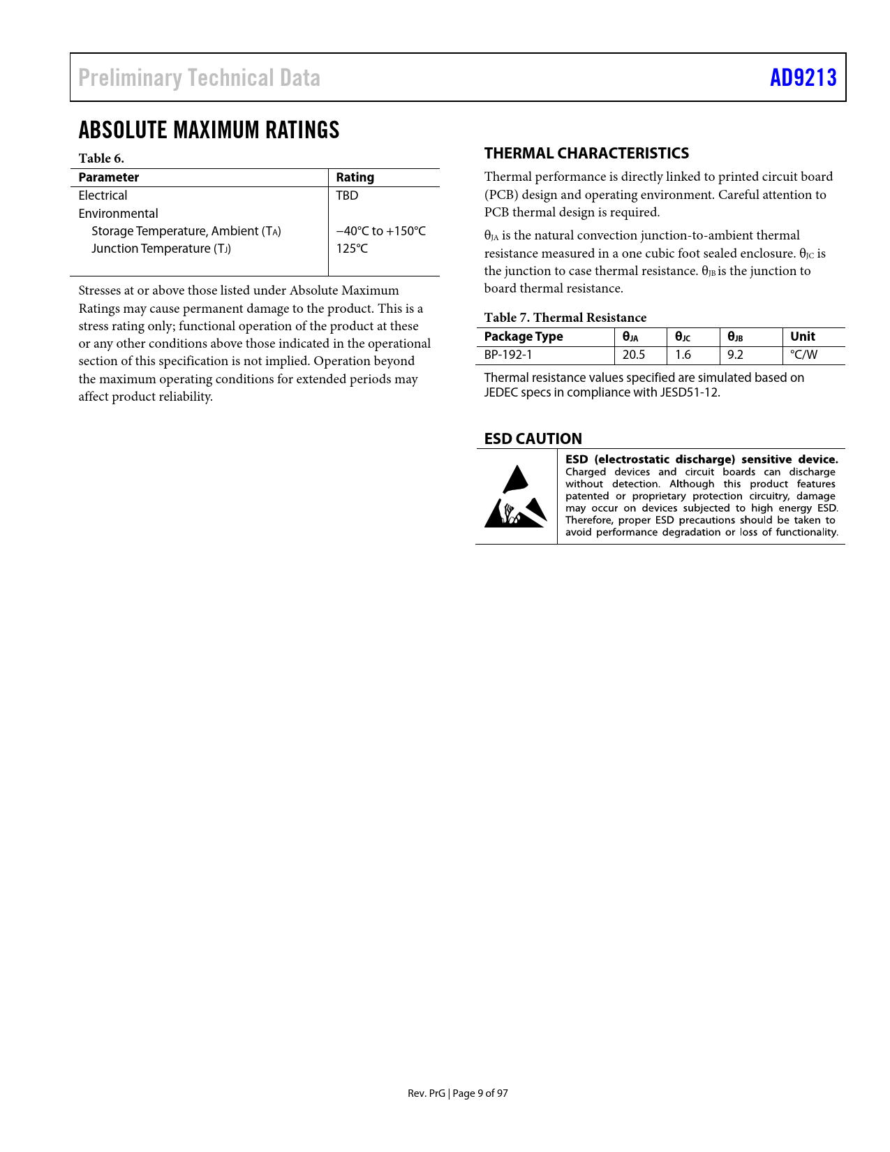 Preliminary Technical DataAD9213ABSOLUTE MAXIMUM RATINGS Table 6.THERMAL CHARACTERISTICSParameter Rating Thermal performance is directly linked to printed circuit board Electrical TBD (PCB) design and operating environment. Careful attention to Environmental PCB thermal design is required. Storage Temperature, Ambient (TA) −40°C to +150°C θJA is the natural convection junction-to-ambient thermal Junction Temperature (TJ) 125°C resistance measured in a one cubic foot sealed enclosure. θJC is the junction to case thermal resistance. θJB is the junction to Stresses at or above those listed under Absolute Maximum board thermal resistance. Ratings may cause permanent damage to the product. This is a Table 7. Thermal Resistance stress rating only; functional operation of the product at these Package Typeθ or any other conditions above those indicated in the operational JAθJCθJB Unit section of this specification is not implied. Operation beyond BP-192-1 20.5 1.6 9.2 °C/W the maximum operating conditions for extended periods may Thermal resistance values specified are simulated based on affect product reliability. JEDEC specs in compliance with JESD51-12. ESD CAUTION Rev. PrG | Page 9 of 97 Document Outline FEATURES GENERAL DESCRIPTION FUNCTIONAL BLOCK DIAGRAM TABLE OF CONTENTS SPECIFICATIONS DC SPECIFICATIONS AC SPECIFICATIONS DIGITAL SPECIFICATIONS SWITCHING SPECIFICATIONS TIMING SPECIFICATIONS Timing Diagrams ABSOLUTE MAXIMUM RATINGS THERMAL CHARACTERISTICS ESD CAUTION PIN CONFIGURATION AND FUNCTION DESCRIPTIONS TYPICAL PERFORMANCE CHARACTERISTICS AD9213-6G AD9213-10G EQUIVALENT CIRCUITS THEORY OF OPERATION ADC ARCHITECTURE ANALOG INPUT CONSIDERATIONS Differential Input Configurations Input Common Mode Input Overvoltage Clamp VOLTAGE REFERENCE CLOCK INPUT CONSIDERATIONS Clock Synthesis Clock Jitter Considerations Power-Down/Standby Mode Temperature Diode and Sensor TMU ADC FAST DETECT FAST THRESHOLD DETECTION (FD) DIGITAL DOWNCONVERTER DDC GENERAL DESCRIPTION Frequency Translation Stage (Optional) Filtering Stage Gain Stage (Optional) Complex to Real Conversion Stage (Optional) DDC FREQUENCY TRANSLATION Variable IF Mode ZIF Mode fS/4 Hz IF Mode Test Mode DDC NCO Description DDC NCO Programmable Modulus Mode DDC NCO Coherent Mode NCO FTW/POW/MAW/MAB Description NCO FTW/POW/MAW/MAB Programmable Modulus Mode Example Calculation NCO FTW/POW/MAW/MAB Coherent Mode Example Calculation NCO Channel Selection GPIO Level Control Mode GPIO Edge Control Mode Profile Select Timer Mode Register Map Mode Setting Up the Multichannel NCO Feature NCO Synchronization NCO Multichip Synchronization NCO Multichip Synchronization at Startup NCO Multichip Synchronization during Normal Operation DDC Mixer Description DDC NCO + Mixer Loss and SFDR DDC DECIMATION FILTERS M2_HB7 Filter Description M2_HB6 Filter Description M2_HB5 Filter Description M2_HB4 Filter Description M2_HB3 Filter Description M2_HB2 Filter Description M2_HB1 Filter Description M1_TB2 Filter Description DDC GAIN STAGE DDC COMPLEX TO REAL CONVERSION DDC EXAMPLE CONFIGURATIONS DIGITAL OUTPUTS INTRODUCTION TO THE JESD204B INTERFACE JESD204B OVERVIEW FUNCTIONAL OVERVIEW Transport Layer Data Link Layer Physical Layer JESD204B LINK ESTABLISHMENT Code Group Synchronization (CGS) and SYNCINB± Initial Lane Alignment Sequence (ILAS) User Data and Error Detection 8-Bit/10-Bit Encoder PHYSICAL LAYER (DRIVER) OUTPUTS Digital Outputs, Timing, and Controls De-Emphasis Phase-Locked Loop SETTING UP THE AD9213 DIGITAL INTERFACE JESD204B Transport Layer Settings Serial Line Rates K Settings DETERMINISTIC LATENCY SUBCLASS 0 OPERATION SUBCLASS 1 OPERATION Deterministic Latency Requirements Setting Deterministic Latency Registers MULTICHIP SYNCHRONIZATION SAMPLED SYSREF MODE AVERAGED SYSREF MODE TEST MODES JESD204B TEST MODES SERIAL PORT INTERFACE MEMORY MAP READING THE MEMORY MAP REGISTER TABLES Open and Reserved Locations Default Values Logic Levels SPI Soft Reset REGISTER DETAILS: SYSTEM CONTROL SIGNALS (SPI_ONLY_REGMAP) REGISTER DETAILS: (USER_CTRL) REGISTER DETAILS: (AD9213_CUST_SPI_REGMAP) REGISTER DETAILS: (MAIN_REGMAP) REGISTER DETAILS: JTX_QBF REGISTER REGISTER DETAILS: DIG_DP_REGMAP REGISTER DETAILS: (AD9213_CUST_REG) REGISTER DETAILS: LCPLL_28NM REGISTER REGISTER DETAILS: JESD204B REGISTER MAP FOR FOUR CHANNELS (JTX_28NM_16CH) APPLICATIONS INFORMATION POWER SUPPLY RECOMMENDATIONS OUTLINE DIMENSIONS