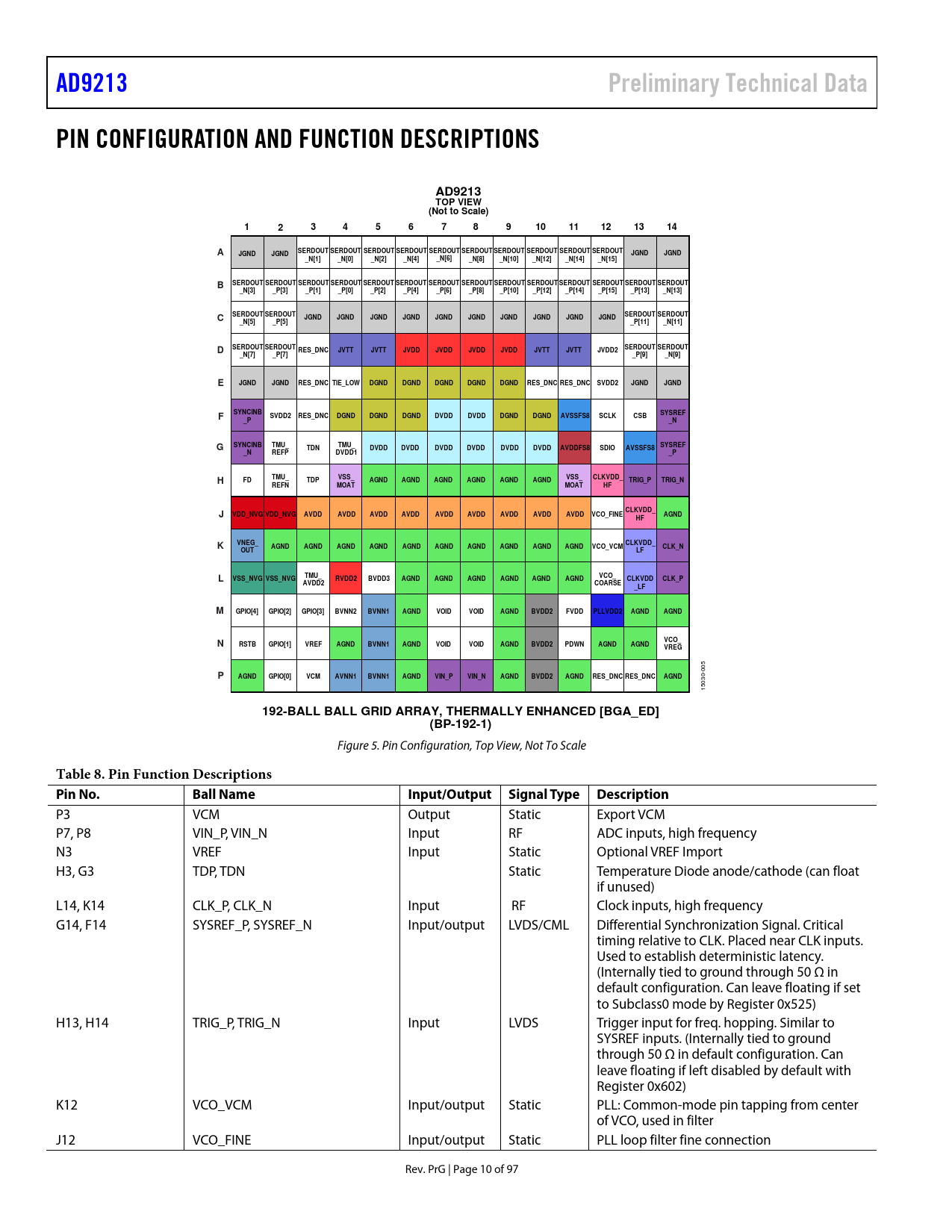 AD9213 Preliminary Technical Data PIN CONFIGURATION AND FUNCTION DESCRIPTIONS AD9213 TOP VIEW (Not to Scale) 1 2 3 4 5 6 7 8 9 10 11 12 13 14 A SERDOUT JGND JGND SERDOUT SERDOUT SERDOUT SERDOUT SERDOUT SERDOUT SERDOUT SERDOUT SERDOUT JGND JGND _N[1] _N[0] _N[2] _N[4] _N[6] _N[8] _N[10] _N[12] _N[14] _N[15] B SERDOUT SERDOUT SERDOUT SERDOUT SERDOUT SERDOUT SERDOUT SERDOUT SERDOUT SERDOUT SERDOUT SERDOUT SERDOUT SERDOUT _N[3] _P[3] _P[1] _P[0] _P[2] _P[4] _P[6] _P[8] _P[10] _P[12] _P[14] _P[15] _P[13] _N[13] C SERDOUT SERDOUT SERDOUT SERDOUT JGND JGND JGND JGND JGND JGND JGND JGND JGND JGND _N[5] _P[5] _P[11] _N[11] D SERDOUT SERDOUT SERDOUT SERDOUT RES_DNC JVTT JVTT JVDD JVDD JVDD JVDD JVTT JVTT JVDD2 _N[7] _P[7] _P[9] _N[9] E JGND JGND RES_DNC TIE_LOW DGND DGND DGND DGND DGND RES_DNC RES_DNC SVDD2 JGND JGND F SYNCINB SVDD2 RES_DNC DGND DGND DGND DVDD DVDD DGND DGND AVSSFS8 SCLK CSB SYSREF _P _N G SYNCINB TMU_ TMU_ SYSREF TDN DVDD DVDD DVDD DVDD DVDD DVDD AVDDFS8 SDIO AVSSFS8 _N REFP DVDD1 _P H TMU_ VSS_ VSS_ CLKVDD_ FD TDP AGND AGND AGND AGND AGND AGND TRIG_P TRIG_N REFN MOAT MOAT HF CLKVDD_ J VDD_NVG VDD_NVG AVDD AVDD AVDD AVDD AVDD AVDD AVDD AVDD AVDD VCO_FINE AGND HF K VNEG_ CLKVDD_ AGND AGND AGND AGND AGND AGND AGND AGND AGND AGND VCO_VCM CLK_N OUT LF L TMU_ VCO_ VSS_NVG VSS_NVG RVDD2 BVDD3 AGND AGND AGND AGND AGND AGND CLKVDD CLK_P AVDD2 COARSE _LF M GPIO[4] GPIO[2] GPIO[3] BVNN2 BVNN1 AGND VOID VOID AGND BVDD2 FVDD PLLVDD2 AGND AGND N VCO_ RSTB GPIO[1] VREF AGND BVNN1 AGND VOID VOID AGND BVDD2 PDWN AGND AGND VREG