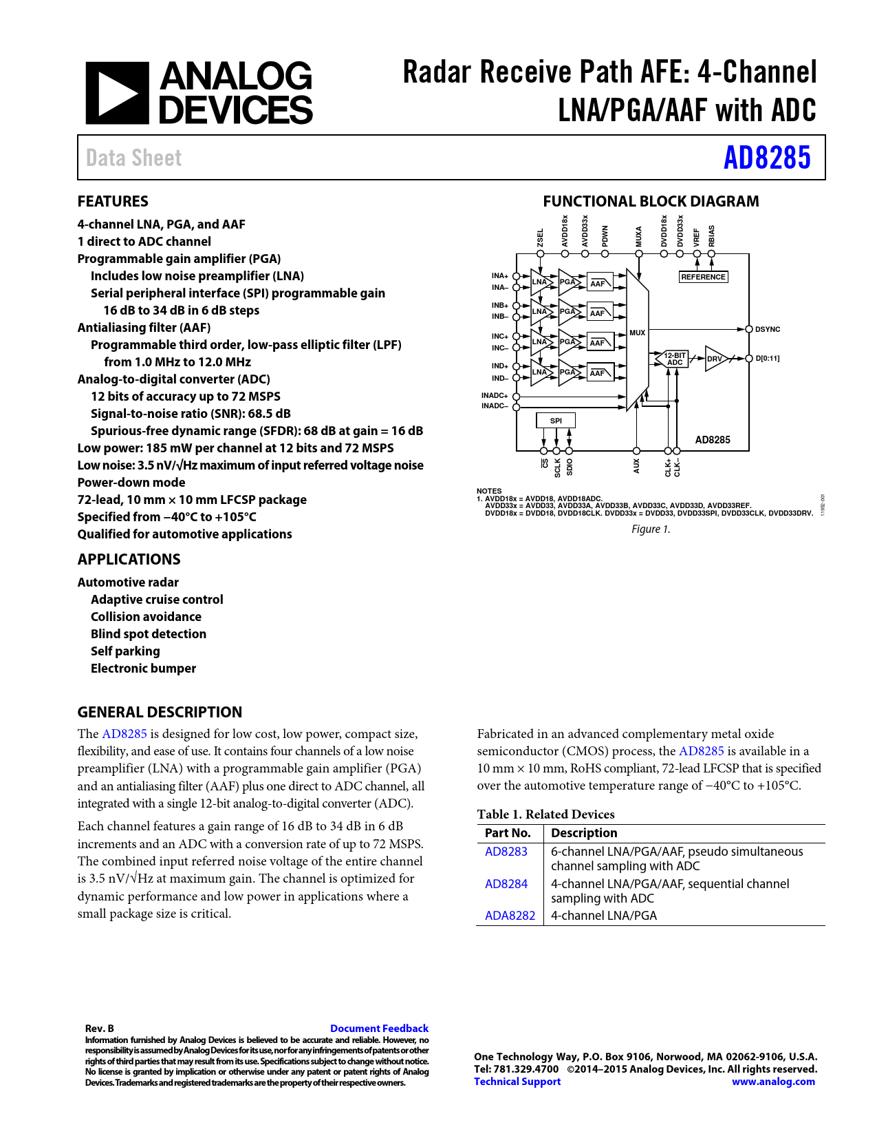 The AD8285 is designed for low cost, low power, compact size, Fabricated in an advanced complementary metal oxide flexibility, and ease of use. It contains four channels of a low noise semiconductor (CMOS) process, the AD8285 is available in a preamplifier (LNA) with a programmable gain amplifier (PGA) 10 mm × 10 mm, RoHS compliant, 72-lead LFCSP that is specified and an antialiasing filter (AAF) plus one direct to ADC channel, all over the automotive temperature range of −40°C to +105°C. integrated with a single 12-bit analog-to-digital converter (ADC).