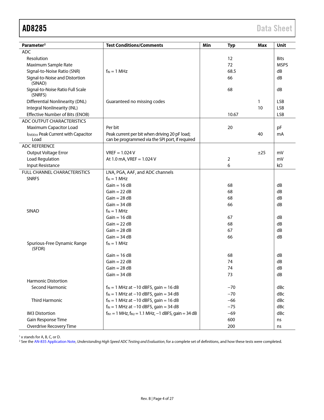Seiten / Seite27 / 4 — AD8285. Data Sheet. Parameter2 Test. Conditions/Comments. Min. Typ. Max. …