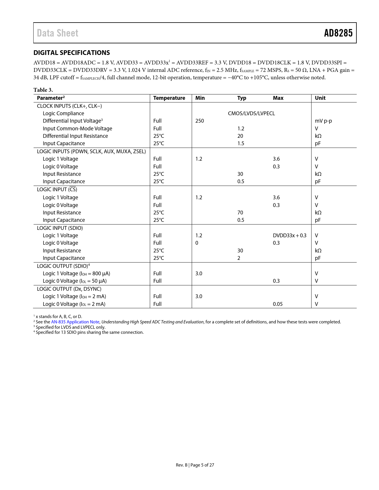 Seiten / Seite27 / 5 — Data Sheet. AD8285. DIGITAL SPECIFICATIONS. Table 3. Parameter2 …