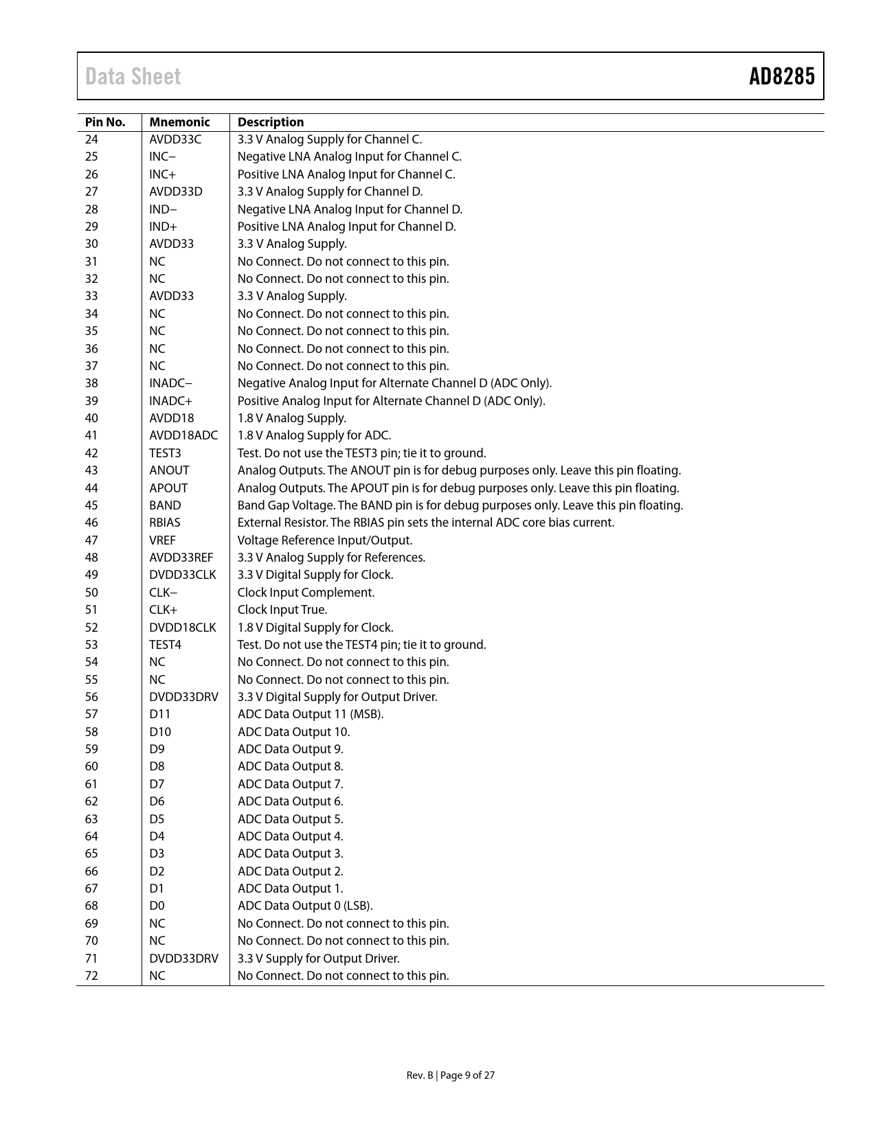 24 AVDD33C 3.3 V Analog Supply for Channel C. 25 INC− Negative LNA Analog Input for Channel C. 26 INC+ Positive LNA Analog Input for Channel C. 27 AVDD33D 3.3 V Analog Supply for Channel D. 28 IND− Negative LNA Analog Input for Channel D. 29 IND+ Positive LNA Analog Input for Channel D. 30 AVDD33 3.3 V Analog Supply. 31 NC No Connect. Do not connect to this pin. 32 NC No Connect. Do not connect to this pin. 33 AVDD33 3.3 V Analog Supply. 34 NC No Connect. Do not connect to this pin. 35 NC No Connect. Do not connect to this pin. 36 NC No Connect. Do not connect to this pin. 37 NC No Connect. Do not connect to this pin. 38 INADC− Negative Analog Input for Alternate Channel D (ADC Only). 39 INADC+ Positive Analog Input for Alternate Channel D (ADC Only). 40 AVDD18 1.8 V Analog Supply. 41 AVDD18ADC 1.8 V Analog Supply for ADC. 42 TEST3 Test. Do not use the TEST3 pin; tie it to ground. 43 ANOUT Analog Outputs. The ANOUT pin is for debug purposes only. Leave this pin floating. 44 APOUT Analog Outputs. The APOUT pin is for debug purposes only. Leave this pin floating. 45 BAND Band Gap Voltage. The BAND pin is for debug purposes only. Leave this pin floating. 46 RBIAS External Resistor. The RBIAS pin sets the internal ADC core bias current. 47 VREF Voltage Reference Input/Output. 48 AVDD33REF 3.3 V Analog Supply for References. 49 DVDD33CLK 3.3 V Digital Supply for Clock. 50 CLK− Clock Input Complement. 51 CLK+ Clock Input True. 52 DVDD18CLK 1.8 V Digital Supply for Clock. 53 TEST4 Test. Do not use the TEST4 pin; tie it to ground. 54 NC No Connect. Do not connect to this pin. 55 NC No Connect. Do not connect to this pin. 56 DVDD33DRV 3.3 V Digital Supply for Output Driver. 57 D11 ADC Data Output 11 (MSB). 58 D10 ADC Data Output 10. 59 D9 ADC Data Output 9. 60 D8 ADC Data Output 8. 61 D7 ADC Data Output 7. 62 D6 ADC Data Output 6. 63 D5 ADC Data Output 5. 64 D4 ADC Data Output 4. 65 D3 ADC Data Output 3. 66 D2 ADC Data Output 2. 67 D1 ADC Data Output 1. 68 D0 ADC Data Output 0 (LSB). 69 NC No Connect. Do not connect to this pin. 70 NC No Connect. Do not connect to this pin. 71 DVDD33DRV 3.3 V Supply for Output Driver. 72 NC No Connect. Do not connect to this pin. Rev. B | Page 9 of 27 Document Outline FEATURES APPLICATIONS FUNCTIONAL BLOCK DIAGRAM GENERAL DESCRIPTION TABLE OF CONTENTS REVISION HISTORY SPECIFICATIONS AC SPECIFICATIONS DIGITAL SPECIFICATIONS SWITCHING SPECIFICATIONS ABSOLUTE MAXIMUM RATINGS ESD CAUTION PIN CONFIGURATION AND FUNCTION DESCRIPTIONS TYPICAL PERFORMANCE CHARACTERISTICS THEORY OF OPERATION RADAR RECEIVE PATH AFE CHANNEL OVERVIEW Low Noise Amplifier (LNA) Recommendation Antialiasing Filter (AAF) Mux and Mux Controller ADC CLOCK INPUT CONSIDERATIONS CLOCK DUTY CYCLE CONSIDERATIONS CLOCK JITTER CONSIDERATIONS SDIO PIN SCLK PIN CS\ PIN RBIAS PIN VOLTAGE REFERENCE POWER AND GROUND RECOMMENDATIONS EXPOSED PADDLE THERMAL HEAT SLUG RECOMMENDATIONS SERIAL PERIPHERAL INTERFACE (SPI) HARDWARE INTERFACE MEMORY MAP READING THE MEMORY MAP TABLE LOGIC LEVELS RESERVED LOCATIONS DEFAULT VALUES APPLICATION DIAGRAMS OUTLINE DIMENSIONS ORDERING GUIDE AUTOMOTIVE PRODUCTS