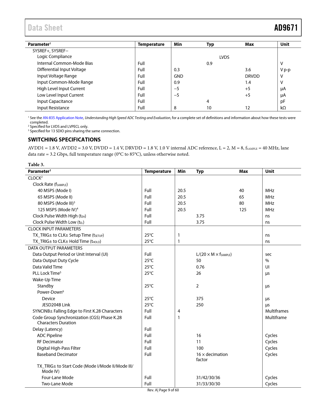 Seiten / Seite60 / 9 — Data Sheet. AD9671. Parameter1 Temperature. Min. Typ. Max. Unit. …